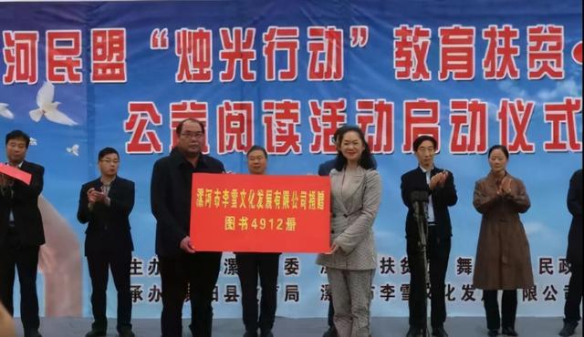 漯河市政协副主席、民盟漯河市委主委罗伟民讲话 此次公益阅读活动是民盟漯河市委积极履行参政党职能、助力脱贫攻坚的又一务实举措,也是优秀盟员主动作为、奉献社会的实际行动。该活动由优秀盟员李雪文化发展有限公司董事长李雪娥带领团队具体实施,活动帮扶期限为两年,共授送图书12次,每次4412册,共53944册图书,主要面向舞阳全县4乡10镇在校贫困学子,累计4000多名学子从中受益。