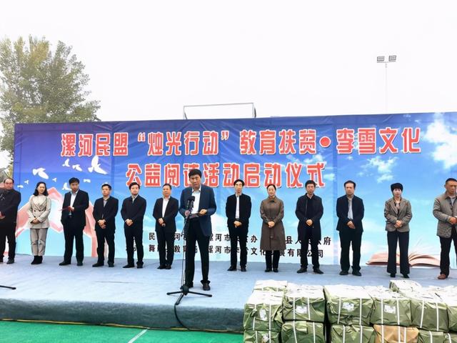 (王国合河南漯河报道)为深入贯彻落实中央、省委、市委脱贫攻坚工作部署,促进农村教育均衡发展和少年儿童健康成长,10月20日,民盟漯河市委联合市扶贫办、舞阳县政府在吴城镇中心学校举办了“烛光行动”教育扶贫•李雪文化公益阅读活动启动仪式。市政协副主席、民盟漯河市委主委罗伟民,市委统战部常务副部长李延恒,市扶贫办党组成员、二级调研员闫长海,民盟漯河市委副主委郭德菊,舞阳县委常委、统战部长崔伟鹏,舞阳县政协副主席骆宜民,漯河市文化发展有限公司董事长李雪娥等出席活动,舞阳县教育局、吴城镇党委、各乡镇中心校相关负责人、吴城镇中心学校师生代表等150多人参加了活动。