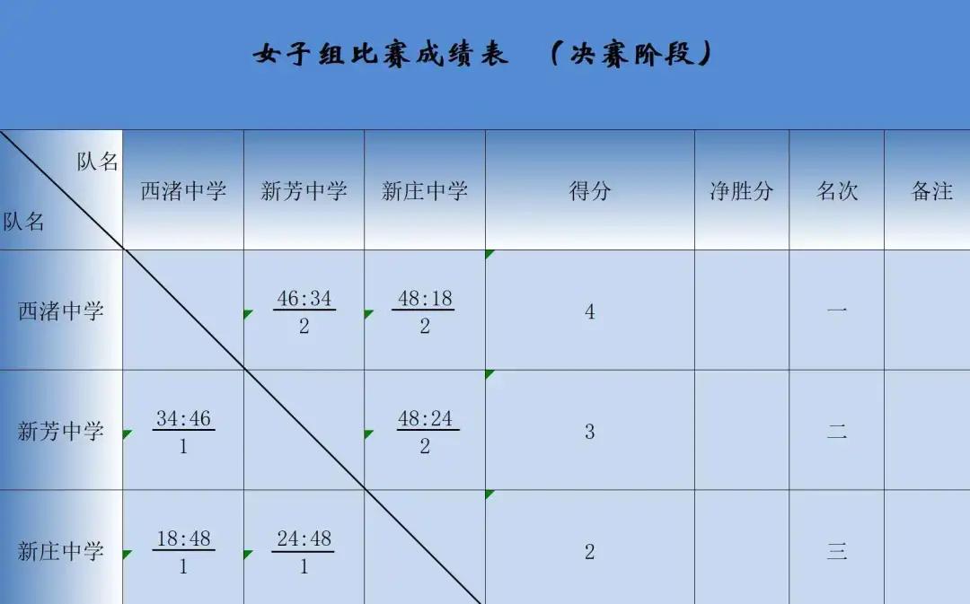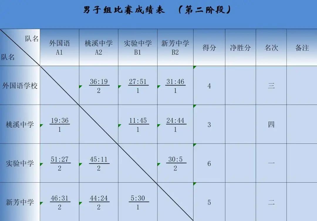经过激烈角逐,最终,实验中学、新芳中学、外国语学校、桃溪中学依次位列男子初中组前四名,西渚中学、新芳中学、新庄中学依次位列女子初中组前三名。