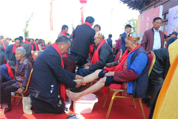 活动现场,前排条桌中央的放着主办方为老人延年益寿祈福定制大寿桃蛋糕,特别光彩夺目。来自施河镇的57位90岁以上老人安座前排,志愿者给所有的老人献上象征吉祥的红围巾、戴上祝福寿比南山寿星帽、赠送祝愿福如东海的书法作品《福》字(由淮安著名书法家李锡贵亲书)。期间,6位爱心企业家分别给每位老人献上爱心大红包。在举行《我为父母洗次脚》中,子女的汗水与父母的泪水相互交融,孝子感恩的心与父母慈爱的心相互交流。尤其是该镇葛庄村71岁的老人郝明喜一直跪着为96岁的老母亲脱袜、洗脚、按摩,推拿20分钟,感动了现场所有的人,彰显在施河这片长寿的土地上孝德文化世代传承。