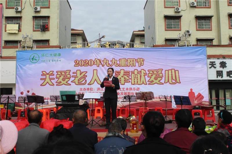 活动仪式上,受怀仁大健康党委书记、工会主席陈毳萍的委托,怀仁大健康党委委员、工会常务副主席李劲湘发表了热情洋溢的致词。长期以来,怀仁大健康秉持“普怀仁爱、康民济世”的企业宗旨,积极热心参与支持老年公益事业,奉献慈善爱心。林承雄董事长不仅自己孝老爱亲,躬身笃行,还在家庭、企业倡导建设孝养文化。2006年,怀仁在全国第一家成立“企业孝养基金”,引导员工孝敬父母,倡导孝道文化,弘扬孝老爱亲的优良传统。九九重阳日,怀仁员工走访慰问敬老院,为贫困山区老人送医送药;成立怀仁金秋养老服务中心,为社区老人提供舒心体贴的健康服务,让社会充满文明、和谐、尊老、爱老的关爱真情,赢得了社会各界的高度肯定与普遍赞誉。今天,携手洪江市大众文化艺术俱乐部举办“九九重阳节 献爱心送温暖”公益活动,就是希望丰富老年人的文化生活,为他们提供力所能及的生活帮助,使老年人的晚年生活过得更加健康快乐。同时,希望在全社会进一步营造尊老、爱老、助老的社会氛围,让尊老敬老之花常开不谢,让所有老年人的物质文化生活得到进一步得到改善,在欢乐、宁静、温馨、和谐中度过幸福的晚年。