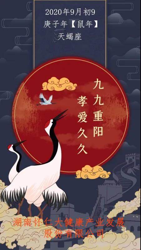 农历九月九日,为传统的重阳节。因为古老的《易经》把“九”定为阳数,九月九日,日月并阳,两九相重,故而叫重阳,也叫重九。九九重阳,九在数字中是最大数,又与“久久”同音,有长久长寿的含意,况且秋季也是一年收获的黄金季节,重阳佳节,寓意深远,不仅是登高眺远,望乡思亲的日子;是品茗赏菊,以畅秋志的日子;自古以来更是常在此日祭祖与推行敬老活动,使重阳节成为尊老敬老、孝老爱亲的传统节日。