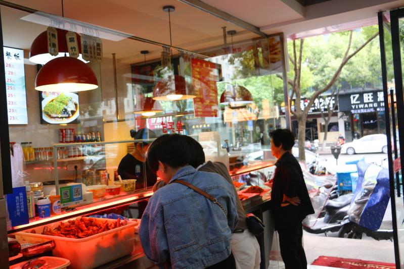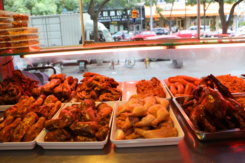 每次下班路过温州市鹿城区宏源路,总会看到一家名叫“精武茶餐厅”的卤味店有不少市民在买酱鸭、猪蹄、香肠、鸭脖、鸡爪等美食。店主李金勇、陈芬还有雇来的员工都紧张有序地忙着。 除了店里,李金勇还要根据顾客的需求,送门上货。“这附近的几个酒店、夜店的卤味都是用我这里的。”李金勇开心地说。