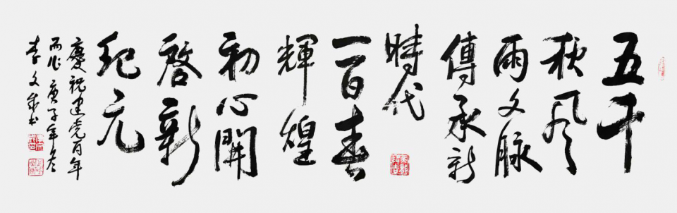 文人翰墨 书贵有品 ——记著名书法家李文成 书法非技,而是传承文化的道。若视书法为技,书匠!若以书法为道,贤家!自古如是。当代著名书法家李文成先生,就是一位以书法为文化之道的贤家。观赏他的书法作品,尽可以见识在锋须往来之际,功在文化弘扬的功德! 李先生是一位传统文化修养很深的学者,有相当正统的文化意识,所以他的书法磨砺以颜筋柳骨为法度核心,把书法写得正大气象。随后又深师二王,琢磨十七帖的天质自然,深临中秋帖的铺陈痛快,把晋代文人法帖研习透彻,数十年经过笔可积山墨染池水的法度汲取,成为博涉多优的书法能家。 笔势论有言,穷研篆籀,功省且易成!李文成先生研习篆籀,一是基于对古文字的深研潭思,二是基于对书法本源的文化探索。世人若不习篆籀,石鼓文的饱满圆厚便无可知,泰山碑的庄严典雅也可无知。不知其源,何琢根本。