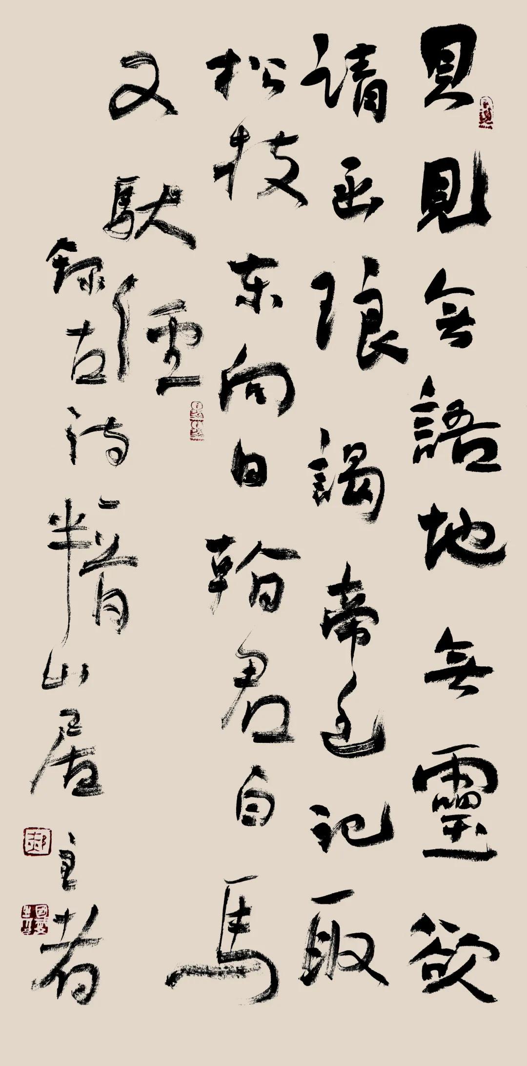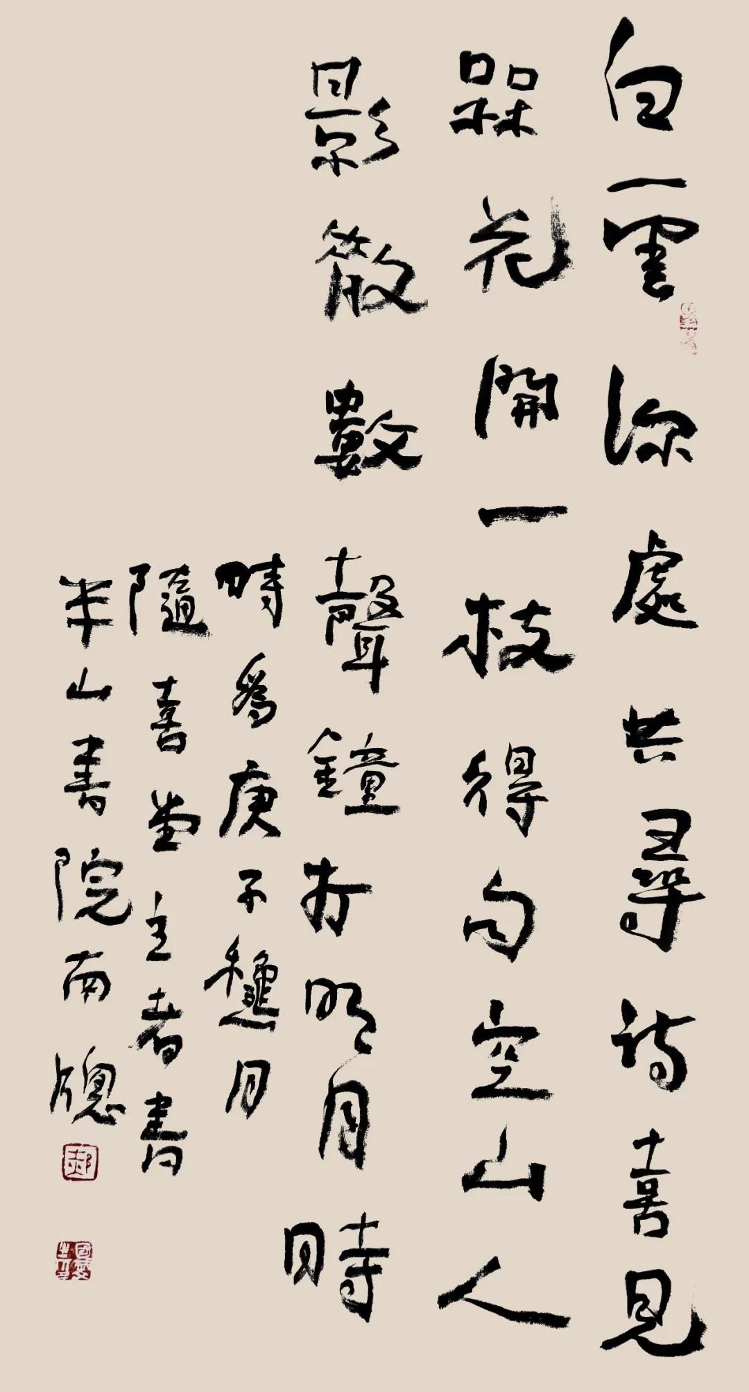 作品名称:八指头陀诗 作品释文: 白云深处共寻诗,喜见梅花开一枝。 得句空山人影散,数声钟打明月时。 作品尺寸:70x38cm