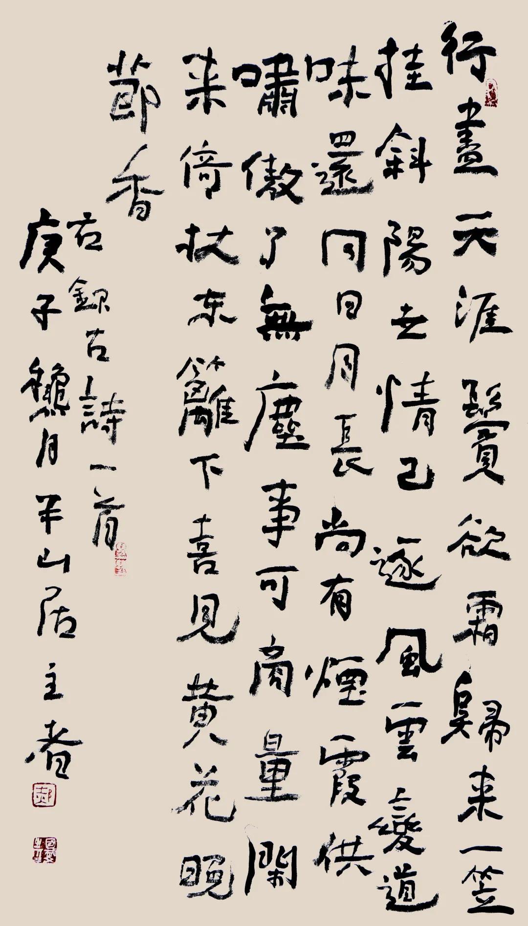 作品名称:八指头陀诗 作品释文: 行尽天涯鬓已霜,归来一笠挂斜阳。 世情己逐风云变,道味还同日月长。 尚有烟霞供啸傲,了无尘事可商量。 闲来倚杖东篱下,喜见黄花晚节香。 作品尺寸:70x40cm
