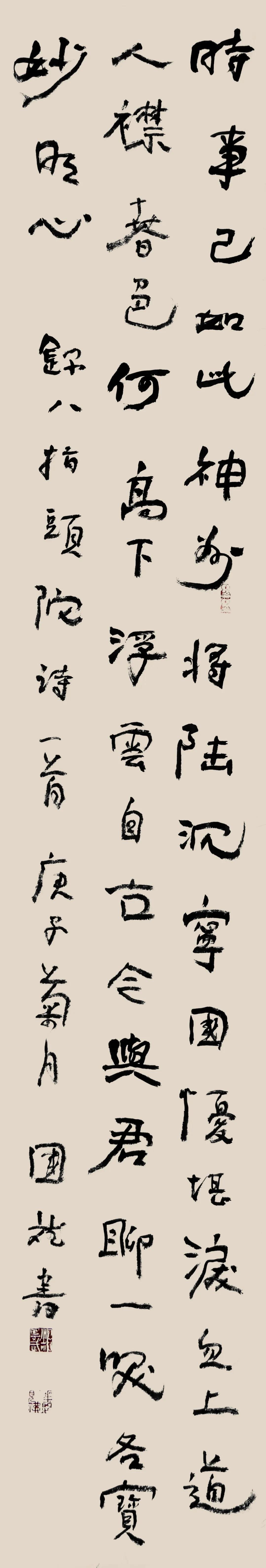 作品名称:八指头陀诗 作品释文: 时事已如此,神州将陆沉。 宁国忧堪泪,忽上道人襟。 春色何高下,浮云自古今。 与君聊一笑,各宝妙明心。 作品尺寸:137x23cm 以下请横观