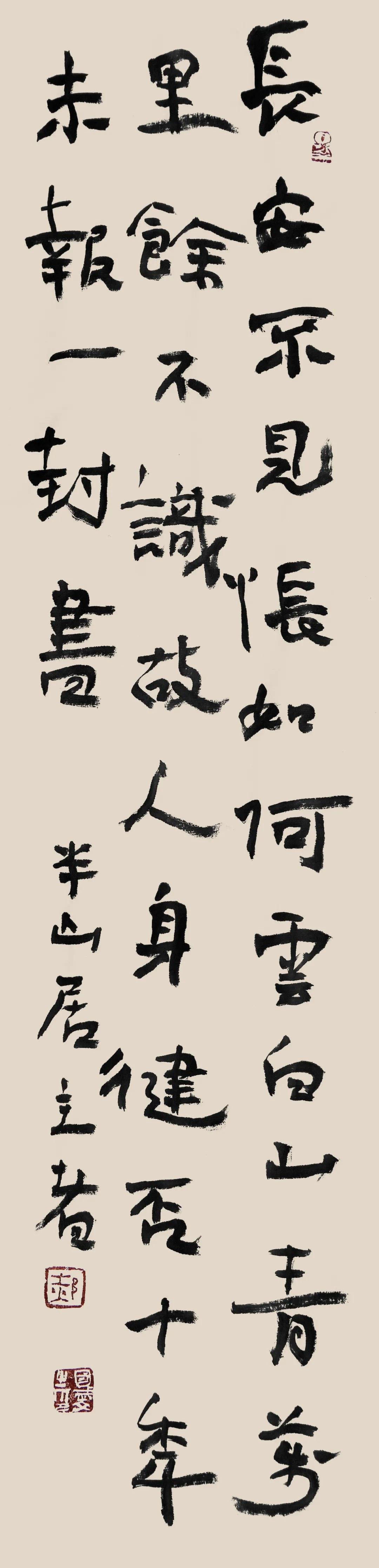 作品名称:八指头陀诗 作品释文: 长安不见怅如何,云白山青万里馀。 不识故人身健否,十年未报一封书。 作品尺寸:70x20cm