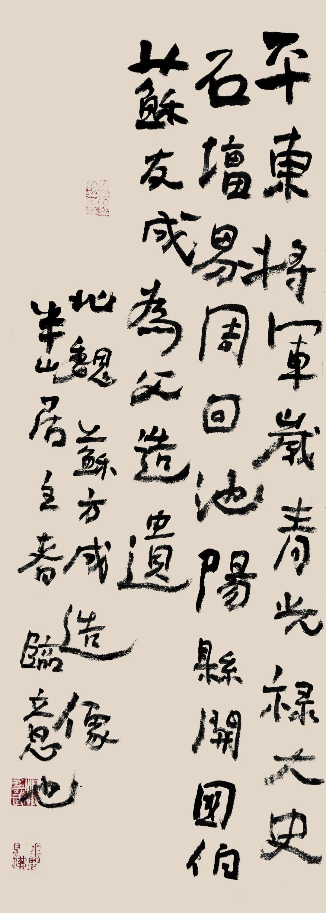 郝国斌 砚边所感 几度风雨,沧桑几度。不变的是对碑学的敬畏和追求…… 墓志作为清代碑学的审美被发现后,对当代书法创作产生了重大的影响。自清中期至民国,前人对碑学的理解,概而言之有二:其一是打破了唐楷及帖学的旧法;其二是打破真草篆隶的体势界限,也就是沈曾植所谓的书体“通变”。我个人认为,还应该加上第三,那就是心智或心法的解放。通过学碑来获得作品形式的创新。 近来年,对造像题记有了些更多的关注,从云冈造像题记、龙门石窟造像题记到巩义石刻题记无不细心揣磨,这种篆隶笔意皆有,並具极强的书写性,一派天然浑成,古穆苍然,稚拙天趣之气的造像题记常常使我震憾和感动。 造像题记所显示的点画、结体形式已超出传统帖学笔法所驾驭的范围,充满了对固有笔画结体范本的“破坏性”。在长期的临创过程中去体会碑学书风所崇尚的“古意”与自然之势。故,或临或创始终注重把握笔墨的构建问题,把握结体中透露出篆隶古意,在不求形似的前提下做到貌离神合,感悟书时之心境。 对于传统帖学进行有选择性读临,求其与碑学的气息、气质暗合,使作品既有血、气、骨之本,又有随心自在,变幻莫测,若满纸云烟,又似熔金冶铁之凝重。 作品欣赏
