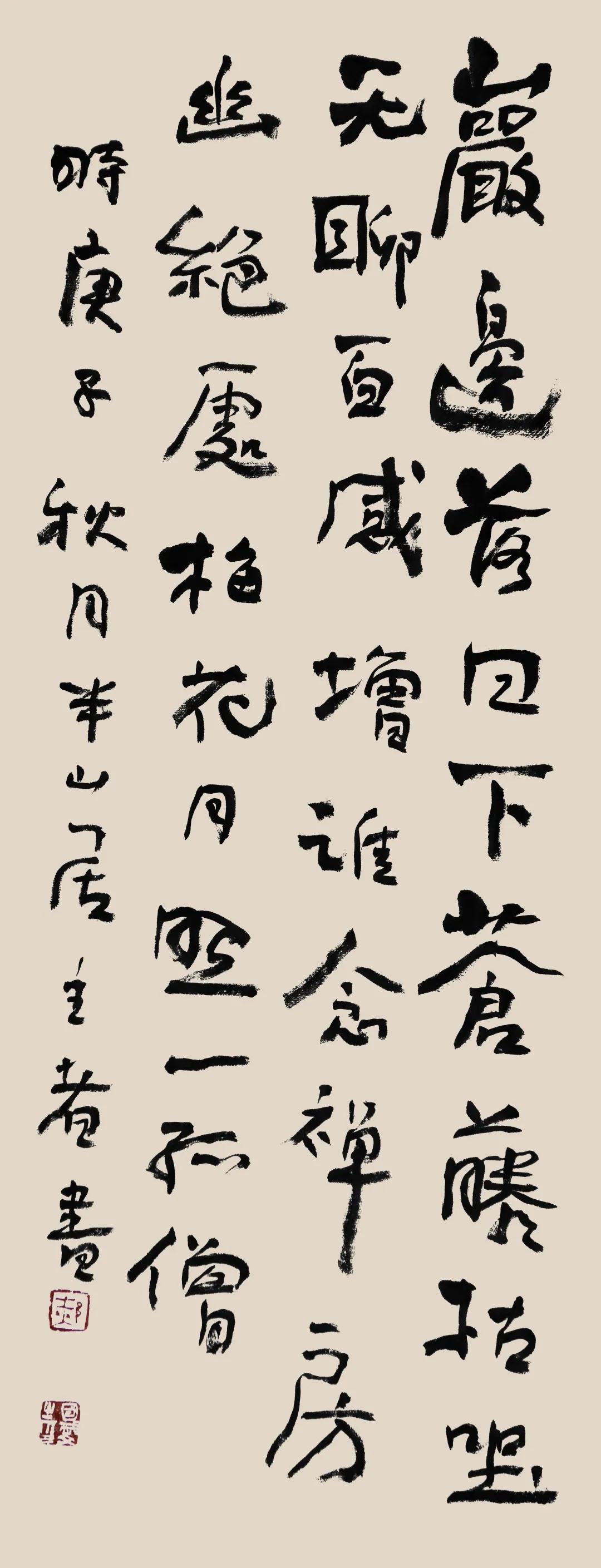 作品名称:八指头陀诗 作品释文: 岩边落日下苍藤,枯坐无聊百感增。 谁念禅房幽绝处,梅花月照一孤僧。 作品尺寸:70x26cm