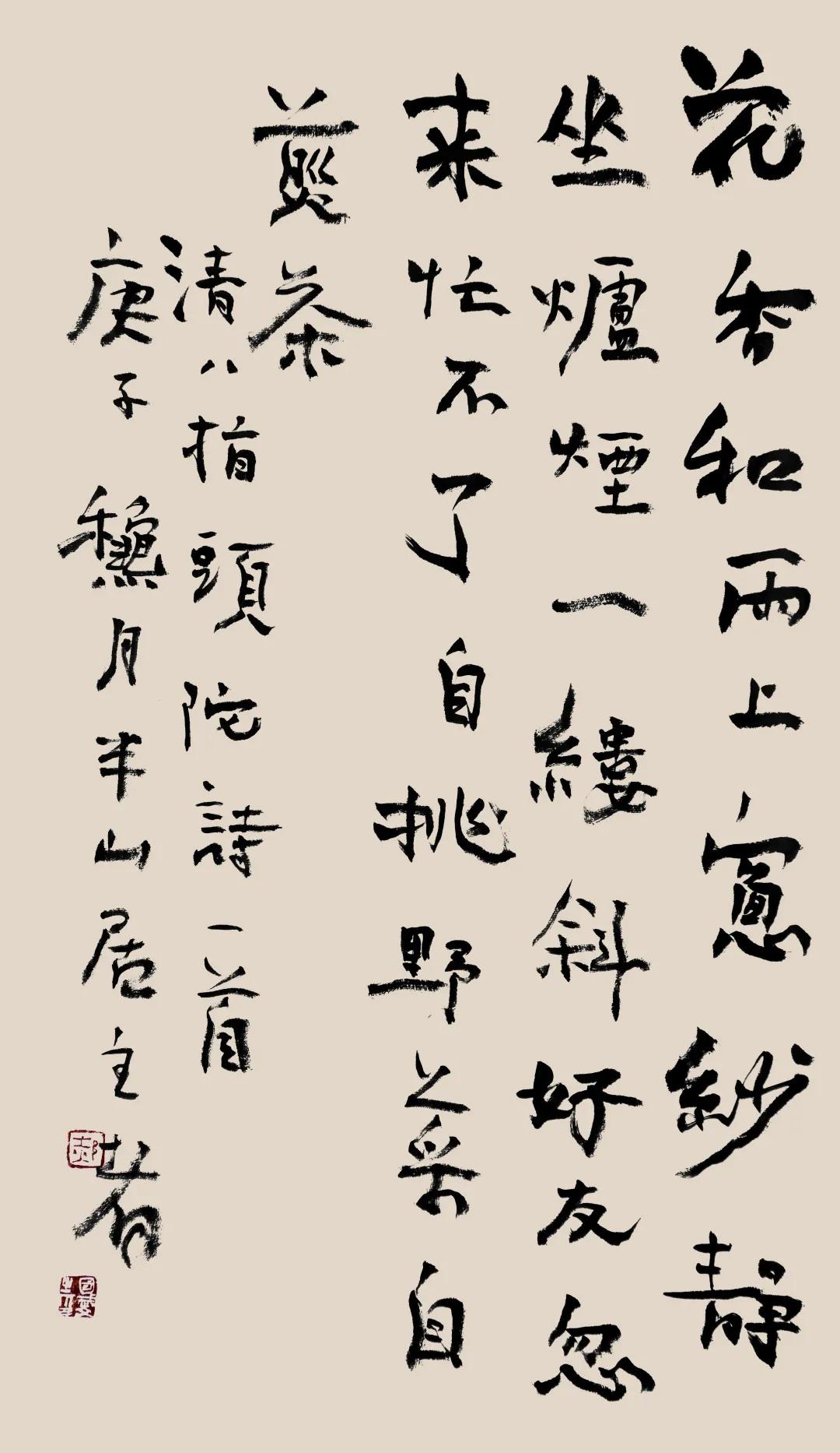 作品名称:八指头陀诗 作品释文: 花香和雨上窗纱,静坐炉烟一缕斜。 好友忽来忙不了,自挑野菜自煎茶。 作品尺寸:70x40cm