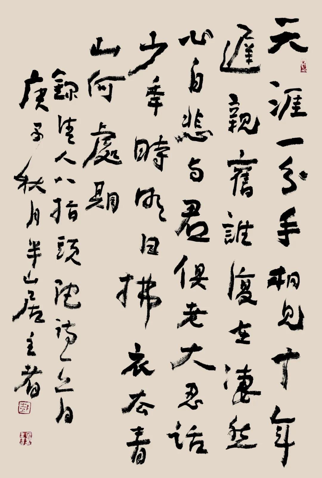 作品名称:八指头陀诗 作品释文: 天涯一分手,相见十年迟。 亲旧谁復生,凄然心自悲。 与君俱老大,忍话少年时。 明日拂衣去,青山何处期。 作品尺寸:70x45cm