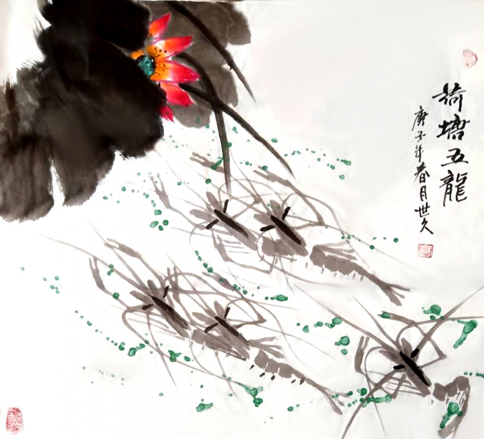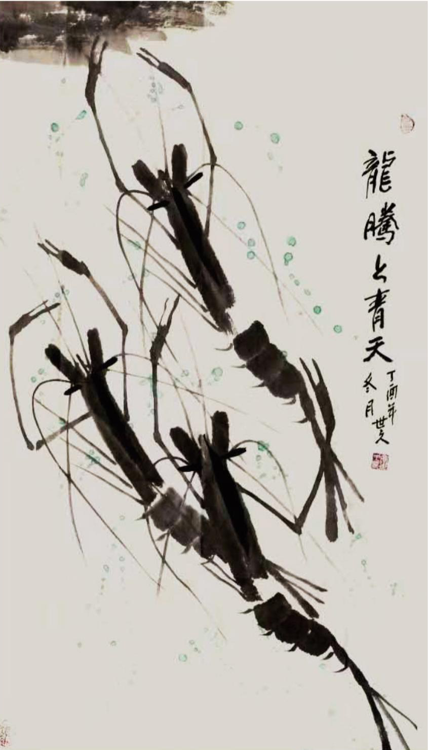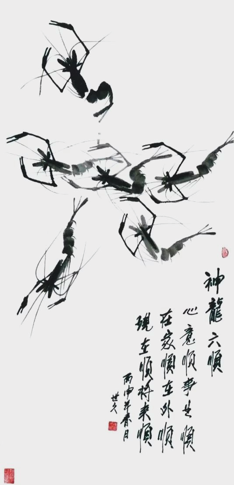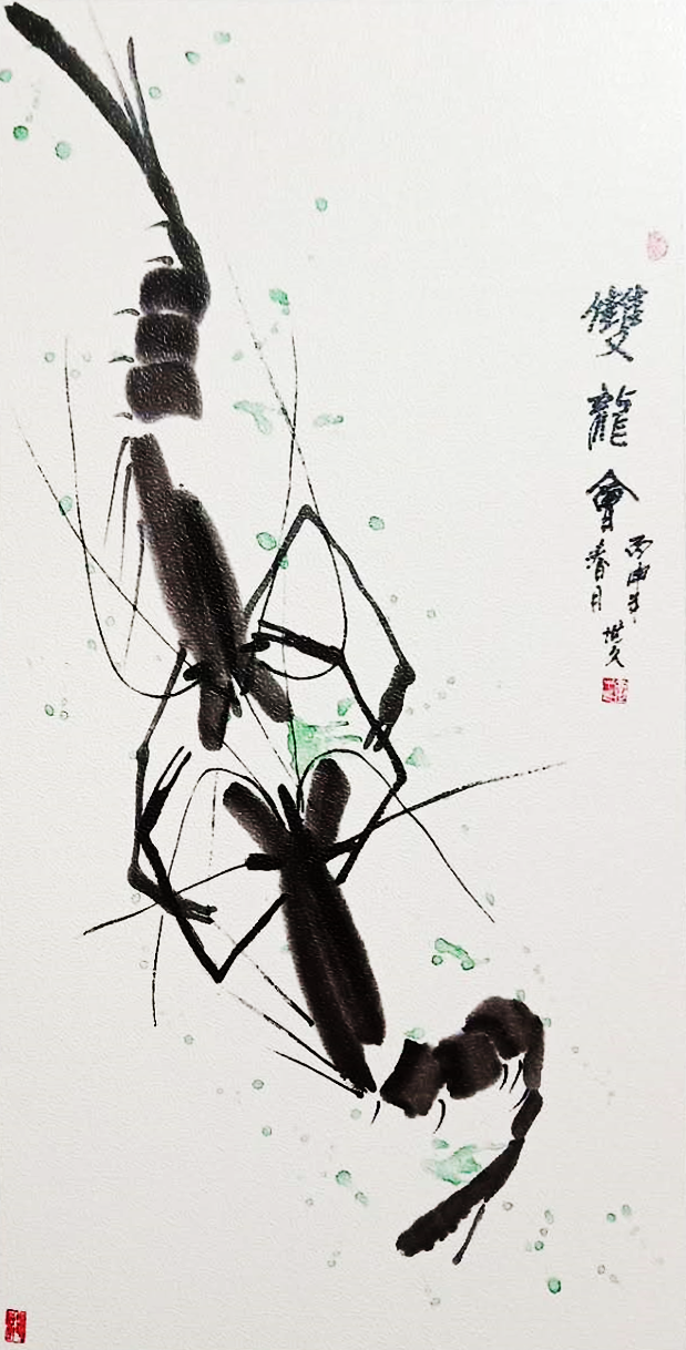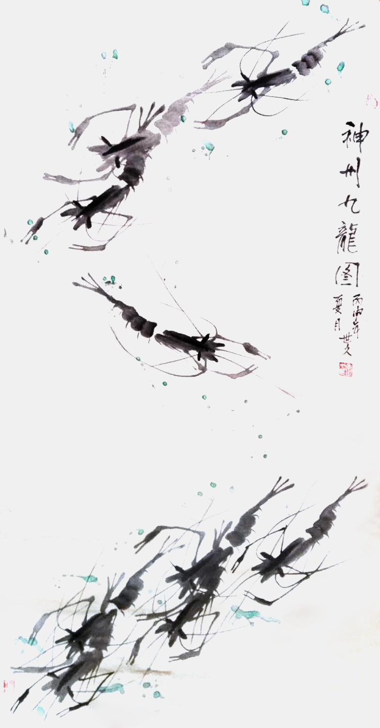 既然是文人,作画必有儒雅之品。看先生画的虾,画的荷花,画的牡丹,无一例外,都是因儒致雅的上上品。他画虾笔墨精神的表现力无以复加,独用焦墨画虾,一反常态,这需要胆识,更需要独树一枝的新法度。焦墨意沉,用来画虾,在一般人的心思里既是异想天开,没有可能!但是高先生独开法门,把焦墨调和的极有钢打铁铸一般的质感,却不枯涩,状显苍润!逸笔触纸,融融而成,绝无呆板的感觉,也是飞仪多姿的形神兼备。 再以锋纤往来画须、画爪,骨法用笔的特征非常明显,落笔钧直,起笔痛快,焦墨写意,从来不显粗糙现象,细处里收拾得相当妥当!梳理一下画史,自古至今,除先生之外没有一人用铁笔焦墨画过虾题!所以先生之画虾,借古开今,与白石的虾画相比,不缺趣味灵性,更是多了一份铁笔龙虾铸精神的格局。小虾题大格局,时代风范融丹青,九龙图寓神州盛!