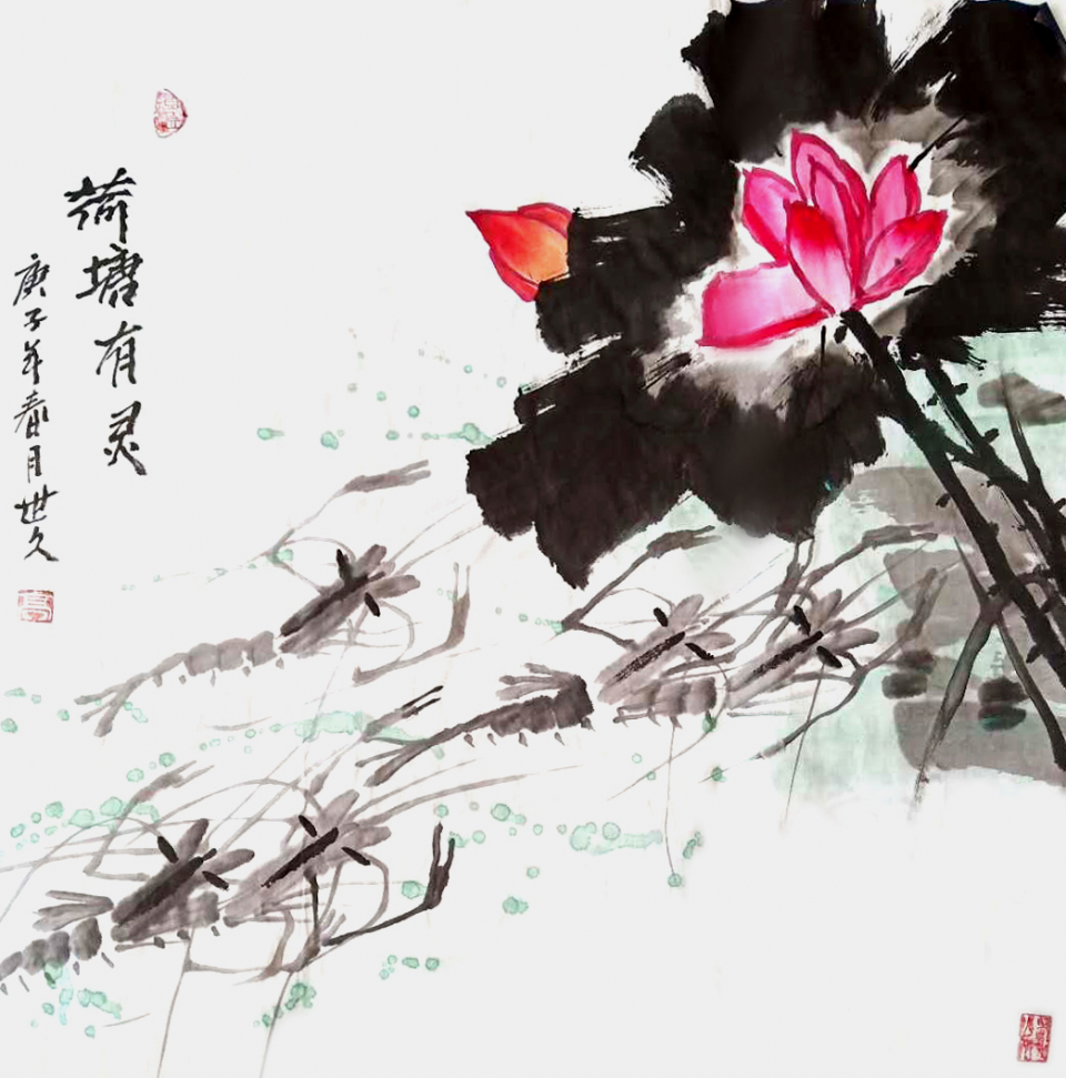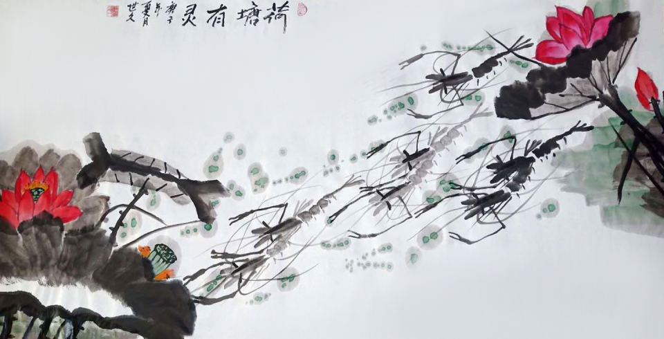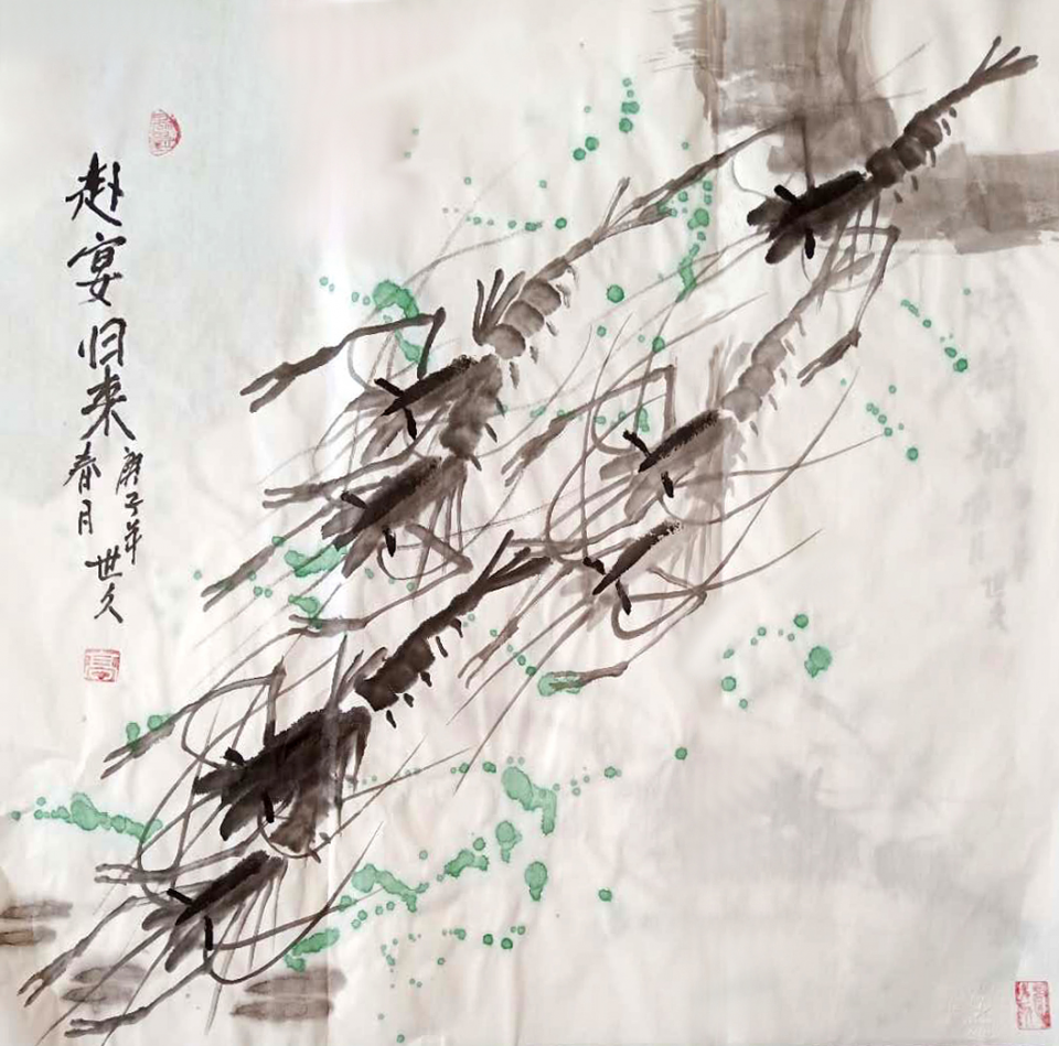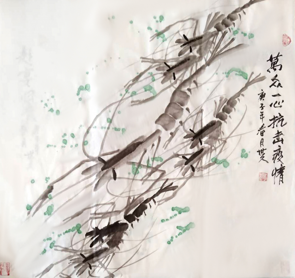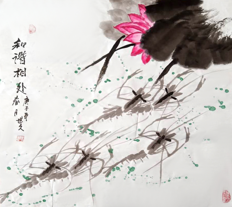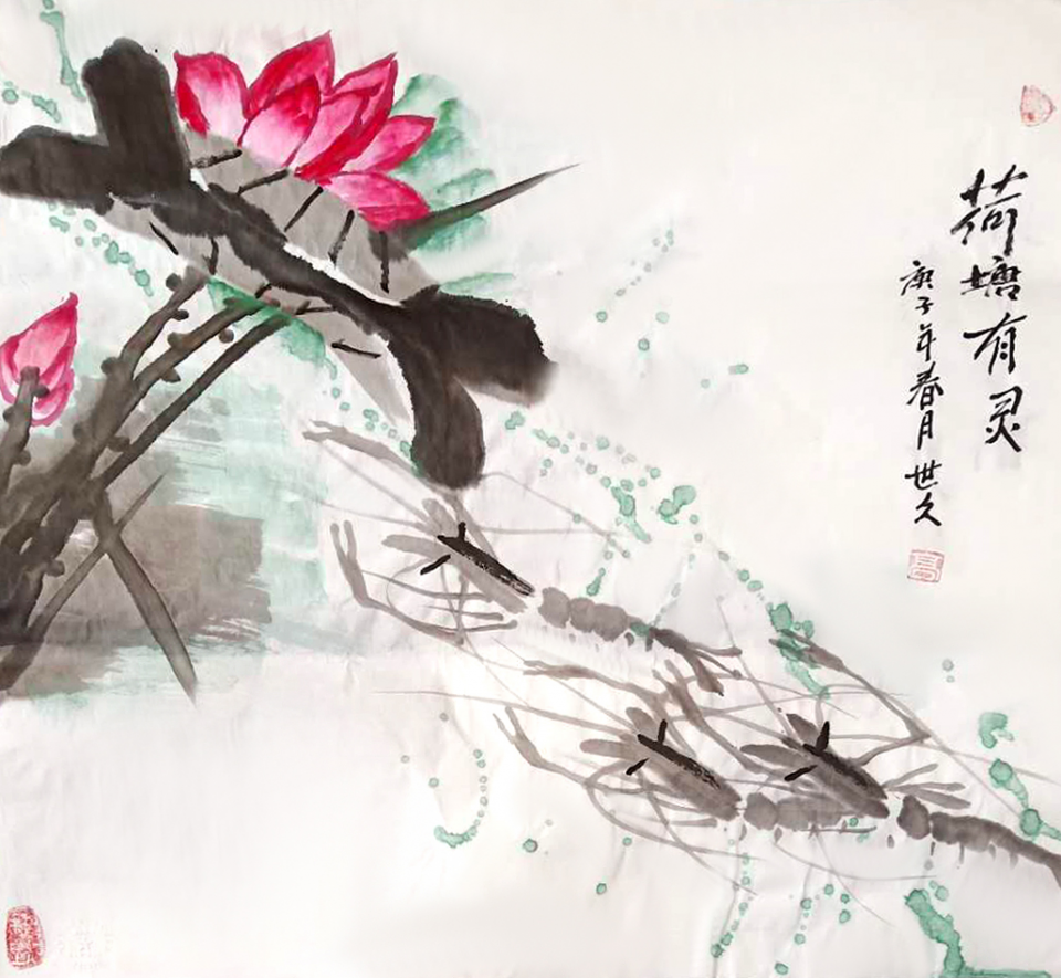 既然是文人,作画必有儒雅之品。看先生画的虾,画的荷花,画的牡丹,无一例外,都是因儒致雅的上上品。他画虾笔墨精神的表现力无以复加,独用焦墨画虾,一反常态,这需要胆识,更需要独树一枝的新法度。焦墨意沉,用来画虾,在一般人的心思里既是异想天开,没有可能!但是高先生独开法门,把焦墨调和的极有钢打铁铸一般的质感,却不枯涩,状显苍润!逸笔触纸,融融而成,绝无呆板的感觉,也是飞仪多姿的形神兼备。 再以锋纤往来画须、画爪,骨法用笔的特征非常明显,落笔钧直,起笔痛快,焦墨写意,从来不显粗糙现象,细处里收拾得相当妥当!梳理一下画史,自古至今,除先生之外没有一人用铁笔焦墨画过虾题!所以先生之画虾,借古开今,与白石的虾画相比,不缺趣味灵性,更是多了一份铁笔龙虾铸精神的格局。小虾题大格局,时代风范融丹青,九龙图寓神州盛!