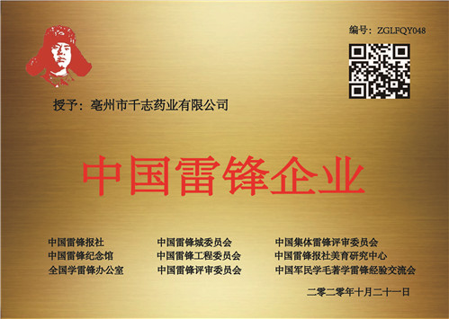 此次亳州市千志药业有限公司被授予“中国雷锋式企业”荣誉,经理井雪杰表示,今后,一定带领亳州市千志药业有限公司的员工大力发展和弘扬雷锋热爱祖国、服务人民、助人为乐的奉献精神,跟随慈善总会,积极参加雷锋公益活动,为弘扬雷锋精神,打造出一片和谐亮丽的风景,为我国慈善事业作出贡献。