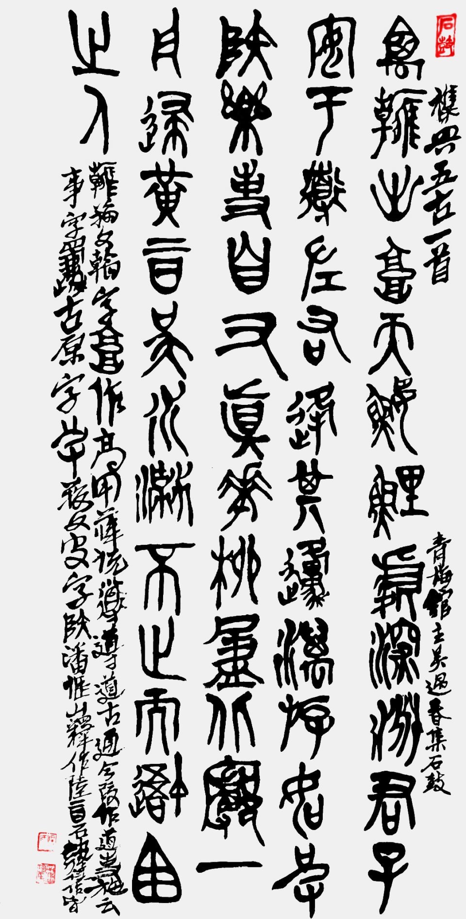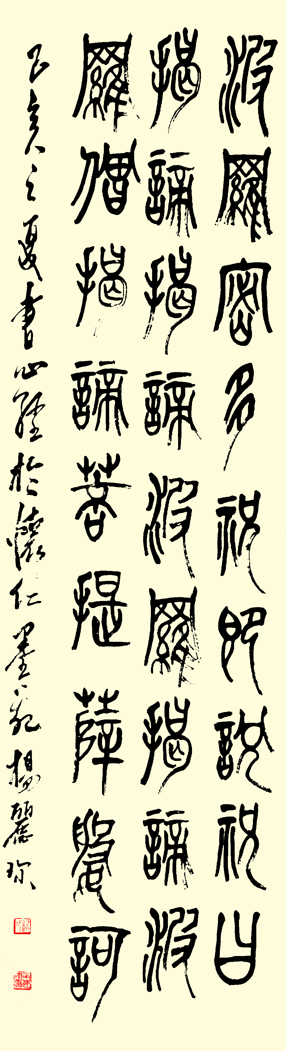 博涉碑帖 书性超群 ——记著名书画家杨丽珍 修炼书法贵在取法,还需要书性超人。所以王羲之作《笔势论》之目的,一是教王献之书法法度,二是“开汝之悟”。当代著名书画家杨丽珍女士之所以取得了不俗的翰墨成绩,就是基于取法为上的磨砺,以及书性超群的表达。她作书法诸书皆成,尤以篆隶行草写得遂心应手。也有不俗的丹青修养,起笔落笔可以创作金书绵画! 她对篆书一体进行了精研潭思。篆书为诸书之源本,如无琢磨,写其他书法就有先天失本的尴尬。杨女士穷研篆籀,功省且易成,写得一手风规高古的好篆书。她的篆书兼取大篆的饱满圆厚和小篆的飞仪多姿,从石鼓文里参意笔法,从泰山碑里寻觅庄严,融会贯通,把篆书写出了雅俗共赏的新体貌。特别是在结体取势上,改变了篆书的对称方整,中轴线自右上至左下稍倾,重心调整的智慧,可以让篆书表现出生动活泼的书写性,让人看得赏心悦目。