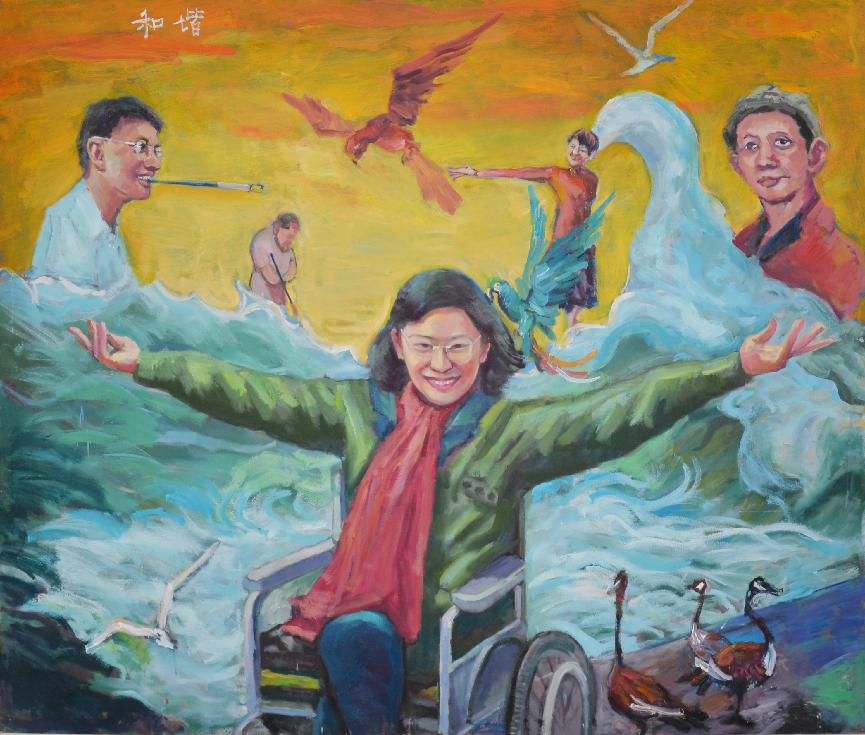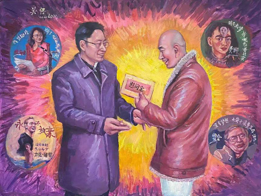 在《以画说话》展厅,我以激赏艳慕的心情,一张不漏地全拍下亚明先生用左手所画的几十副作品。这些作品有的是顽强与命运抗争的自画像,有的是体现父女之爱、夫妻之爱、友情之爱的温馨画作,有的是中央领导视察阜阳大建设、大发展的场景,非常贴近生活,贴近群众,具有时代气息。他深情地爱着他视为生命的绘画艺术,深情地爱着这个充满美好的世界,深深地感谢每一位关心帮助他的人。他表示在不久的将来,让"金左手"再创辉煌! 画画的人本来就有品味不庸俗,有学识不浅薄,有风度不轻狂,有情趣懂生活,懂审美善创意,与他相处,会拥有好心情,提高自身艺术修养。