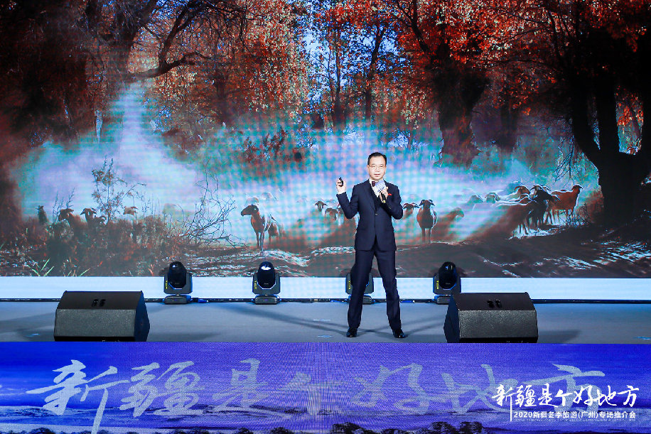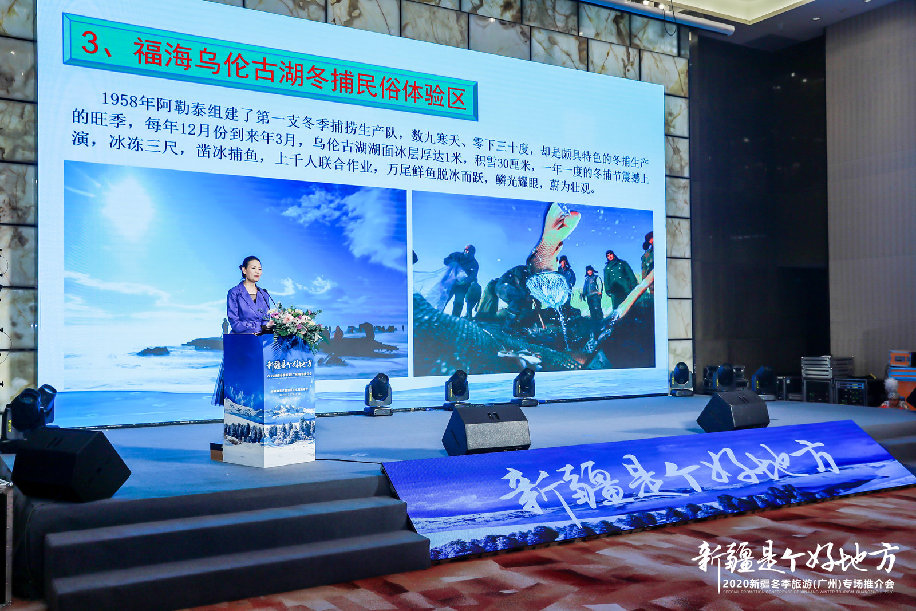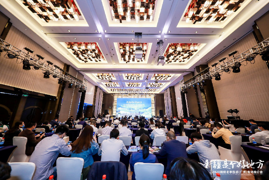 11月13日,2020新疆冬季旅游推广营销活动走进广州。 推介会上,乌鲁木齐南山丝绸之路滑雪场“骄阳滑雪”、火洲吐鲁番的研学盛宴、人类滑雪起源地“中国雪都”阿勒泰、和田尼雅遗址、神秘的楼兰古城、“大西洋最后一滴眼泪”赛里木湖等一一呈现在大屏幕上,为广州市民开启了一场震撼心灵的西北风情“云上之旅”。
