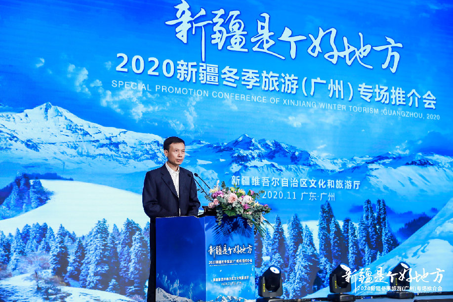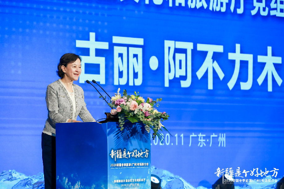 新疆维吾尔自治区文化和旅游厅党组成员、副厅长古丽·阿不力木致辞。 新疆维吾尔自治区文化和旅游厅党组成员、副厅长古丽·阿不力木致辞时说,“世界之美,尽在新疆。冬季在北疆,您可以在人类滑雪起源地、“中国雪都”阿勒泰听落雪的声音,看赛里木湖的冰泡、天山天池的雪景;您可以穿着毛衣在最温暖的、离城市最近的乌鲁木齐丝绸之路滑雪场感受滑雪、戏雪、赏雪的乐趣,再美美地泡个温泉,享受冰火两重天的惬意;您可以去南疆拍摄浩瀚的沙漠、雅丹地貌、丹霞景观、胡杨雾凇,在领略各民族风情的同时,品尝各种特色美食,新疆的冬天别有一番天地。 古丽·阿不力木说,今天我们欢聚在美丽花城,开展冬季旅游推介活动,共建旅游交流与合作平台,新疆和广东两地市场合作潜力巨大。