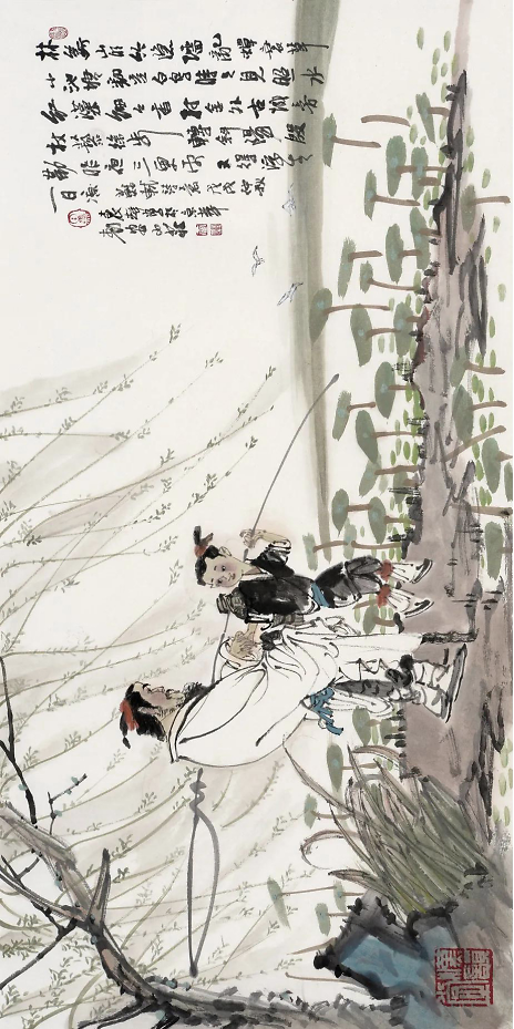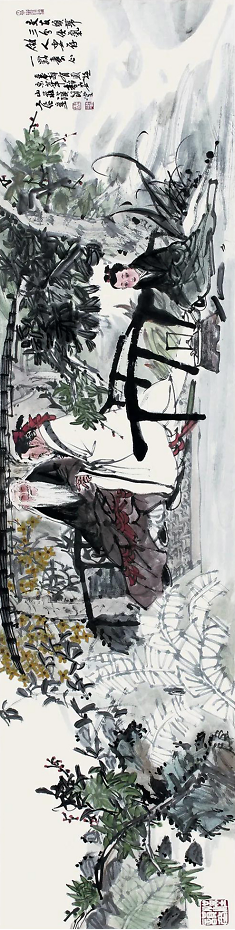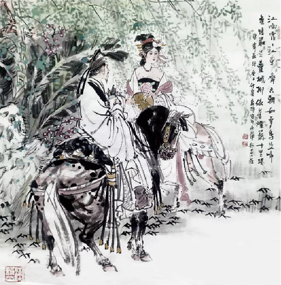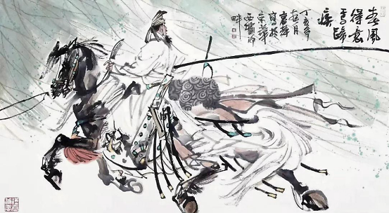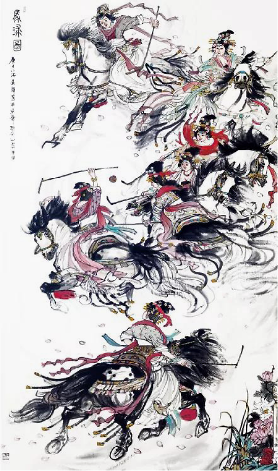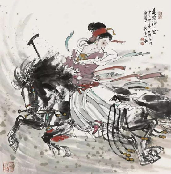 我最常画的题材就是鞍马人物,尤其是马球图系列和春风得意马蹄疾系列。这些都是我念兹在兹的描绘对象。我最常用的一枚压角章就是“汉唐雄风”。所以,多年来我钟情于汉唐风骨,追求笔墨浑厚华滋,意韵深沉、恣肆磅礴。这也是我内心审美的一种追求。我喜欢在画面中拥有挥洒自如的书写性、苍劲浑厚的金石味,金戈铁马般的大气象,从而构成风樯阵马般“梦回汉唐”华滋浑厚的境界,得大自在。