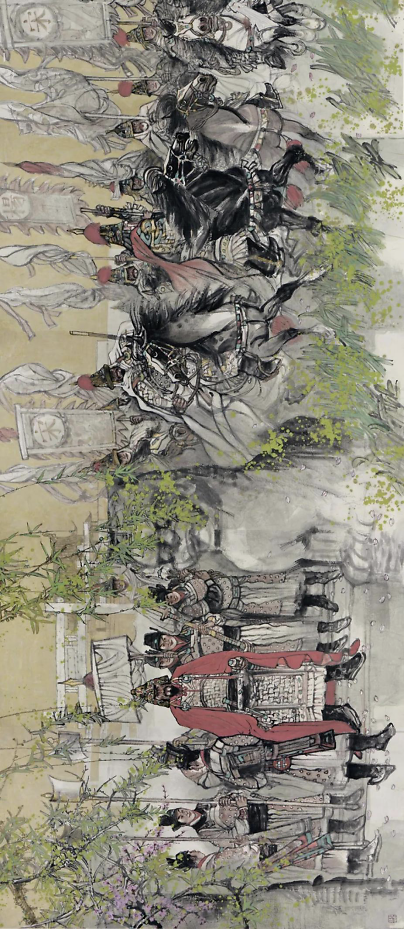 欣赏袁辉先生的新作国家艺术基金项目——《杨六郎威震雄州》,显然可见,画家凭自己的才气和实干向既定艺术目标迈出了值得珍视的一步,形成了足以表明其审美情趣、彰显其心路历程,施展其学院派艺术优势的绘画格式。逸静而大气,沉静而不荒寂,飘逸而不浅薄,瑰丽而不浮艳,巧构而不做作,场面宏大而不潦草,言故乡事而打动国人,是袁辉先生新作予我的总体审美印象。让我非常激动。