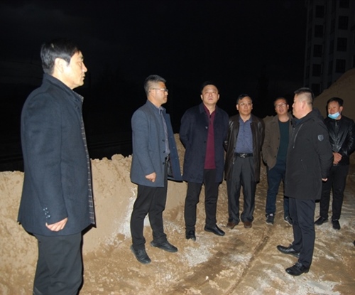 图为魏振东书记(左三)在一处建筑施工现场对施工单位侵线堆土问题,进行现场办公