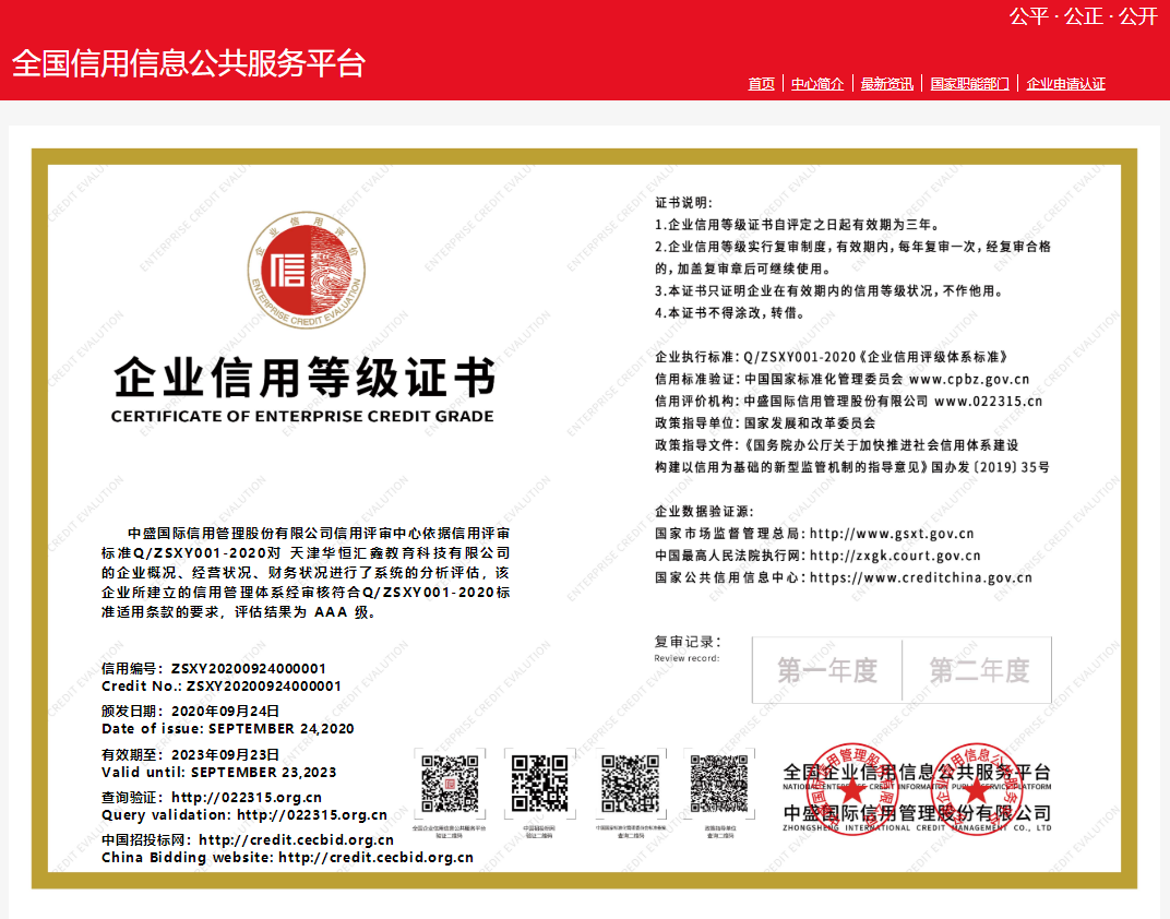 2020年09月24日,由专业的第三方信用服务机构、全国企业信用信息公共服务平台、中盛国际信用管理股份有限公司通过国际通行的“四等十级制”评价等级对天津华恒汇鑫教育科技有限公司进行多维度考核,评价要素主要包括基本条件、企业状况、经营管理能力、财务状况、信用记录等方面进行综合信用评价,通过信用评价办公室初审、专家评审委员会审定,经严格评选之后最终确定。 评价结果在全国企业信用信息公共服务平台和工业信息化部指定发布招标信息网站中国招标投标网予以公示。