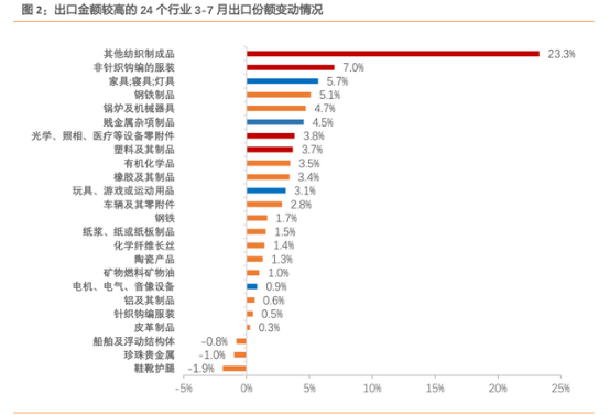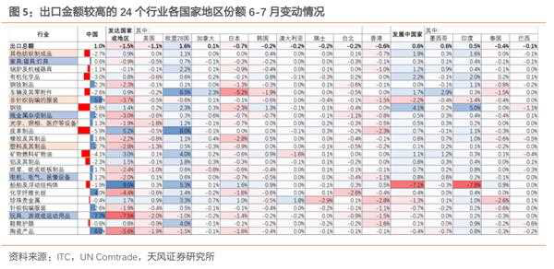 根据数据计算,今年前 7 个月主要经济体的 24 个行业出口份额的变动情况。