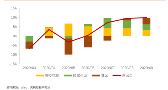今年以来,出口在行业上表现出明显的分步复苏特征:第一步,3月中国复工复产后,防疫抗疫类行业出口先行复苏,对总出口的增长起到了关键性作用。第二步与居家生活相关性较高,需求受到了疫情的间接催化。5 月之后,防疫抗疫品类的贡献逐渐回落,居家生活品类对总出口的贡献由负转正,同步拉动出口高增。第三步是顺周期的其他行业出口,复苏节奏相对较慢,订单直到三季度末才逐渐好转。