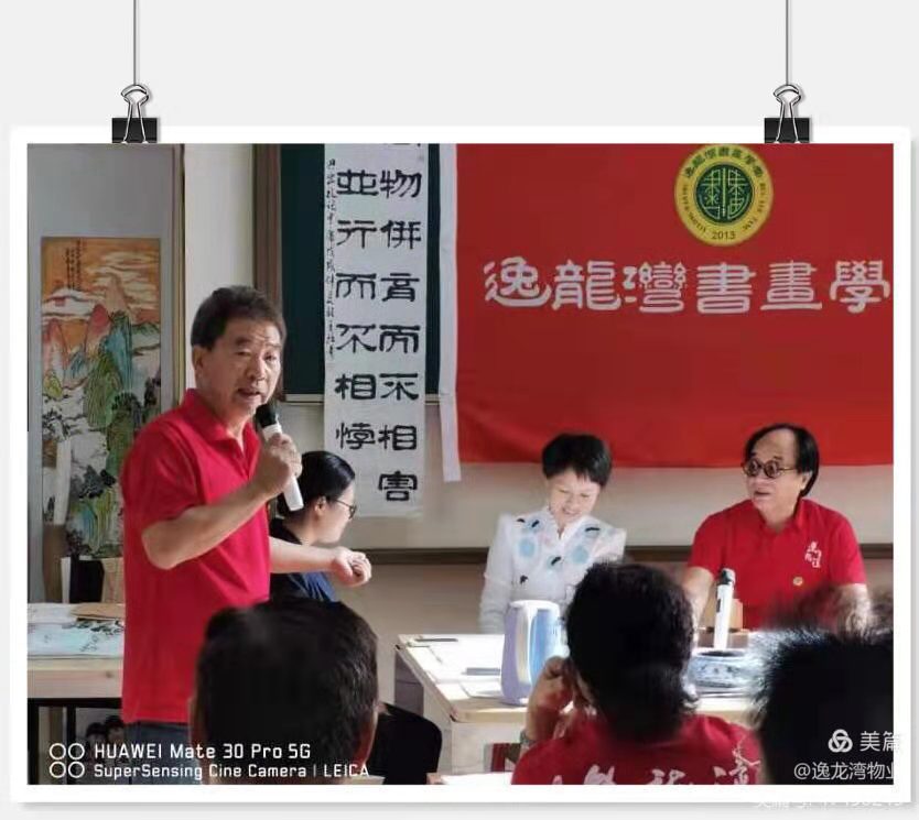 他在开班仪式上,回顾了逸龙湾书画学堂7年来的发展历程,总结了7年办学的四点经验,一是至力于小区精神文明建设 ,主动征得平海建设,逸龙湾社区党的领导,在园区多次举办庆十一书画展,迎春送福活动。二是坚持“两为”方针,提出“翰墨薪传,不忘初心”的办学宗旨,下农村进学校,普及中国书画知识。三是坚持公益办学,规范管理,免费教学,示范辅导,吸引了广大人群入学。四是由书画向综合性知识课堂转换。开辟了文史知识讲座,诗词鉴赏沙龙,骑行赏自然活动。常务副校长黄铭烈,秘书长薛松奇也讲了话。