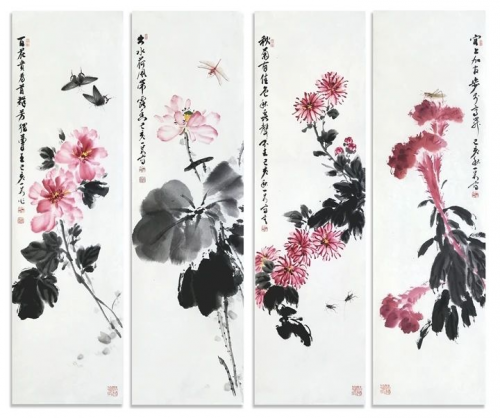 尹伟 花卉草虫四条屏
