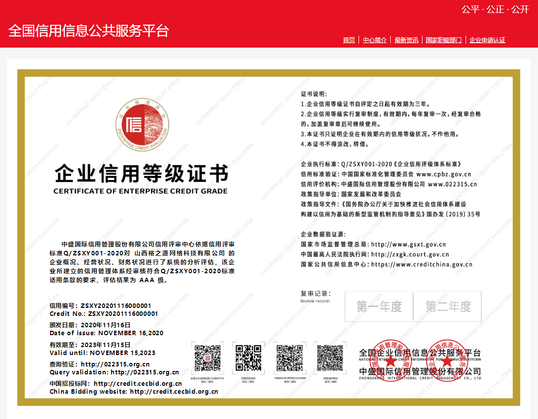 2020年11月16日,由专业的第三方信用服务机构、全国企业信用信息公共服务平台、中盛国际信用管理股份有限公司通过国际通行的“四等十级制”评价等级对山西裕之源网络科技有限公司进行多维度考核,评价要素主要包括基本条件、企业状况、经营管理能力、财务状况、信用记录等方面进行综合信用评价,通过信用评价办公室初审、专家评审委员会审定,经严格评选之后最终确定。 评价结果在全国企业信用信息公共服务平台和工业信息化部指定发布招标信息网站中国招标投标网予以公示。