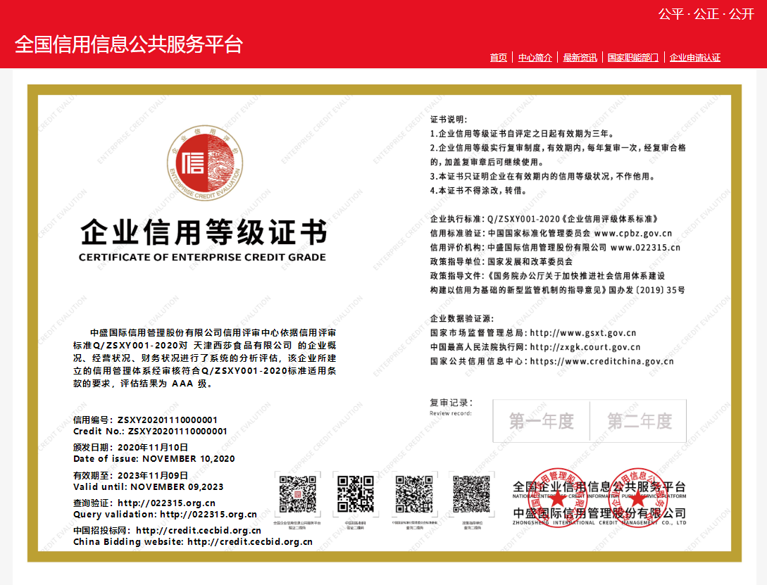 2020年11月10日,由专业的第三方信用服务机构、全国企业信用信息公共服务平台、中盛国际信用管理股份有限公司通过国际通行的“四等十级制”评价等级对天津西莎食品有限公司进行多维度考核,评价要素主要包括基本条件、企业状况、经营管理能力、财务状况、信用记录等方面进行综合信用评价,通过信用评价办公室初审、专家评审委员会审定,经严格评选之后最终确定。 评价结果在全国企业信用信息公共服务平台和工业信息化部指定发布招标信息网站中国招标投标网予以公示。