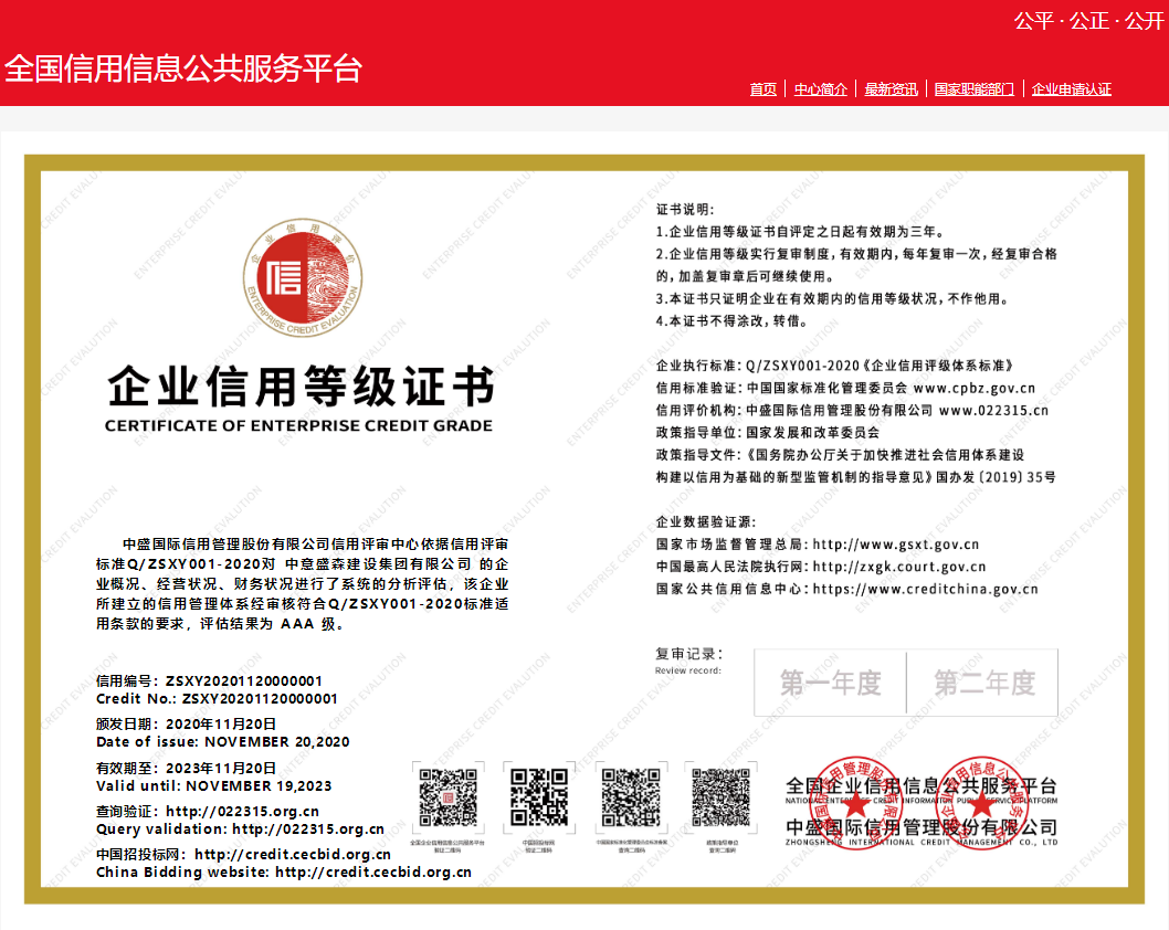 2020年11月20日,由专业的第三方信用服务机构、全国企业信用信息公共服务平台、中盛国际信用管理股份有限公司通过国际通行的“四等十级制”评价等级对中意盛森建设集团有限公司进行多维度考核,评价要素主要包括基本条件、企业状况、经营管理能力、财务状况、信用记录等方面进行综合信用评价,通过信用评价办公室初审、专家评审委员会审定,经严格评选之后最终确定。 评价结果在全国企业信用信息公共服务平台和工业信息化部指定发布招标信息网站中国招标投标网予以公示。