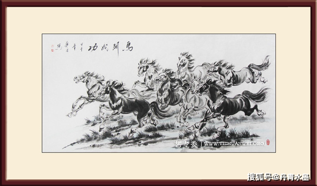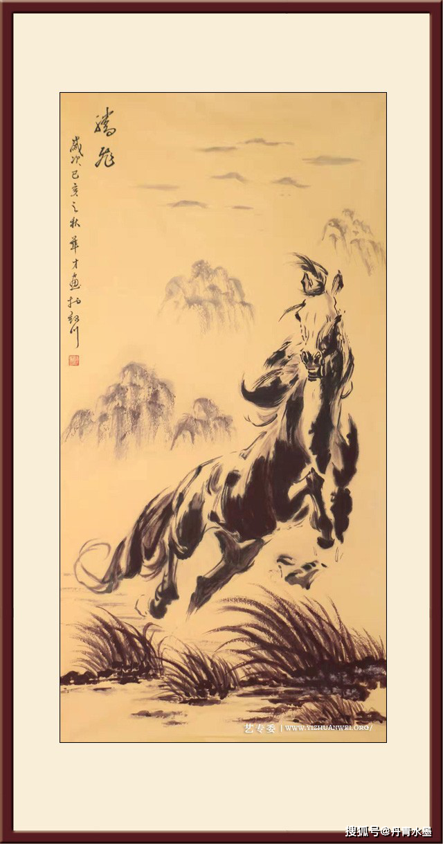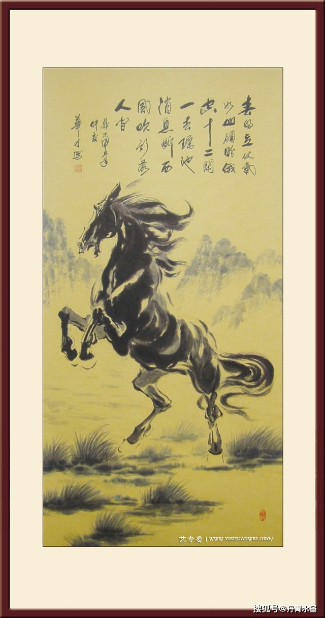 写意画马,则是于华才先生超能的笔墨功夫之表现!他画的马不因肥而臃,不因瘦而枯,微肉而多骨,可画西风烈!长空烈马,极见精气神!勾勒之笔钢打铁铸,皴染之笔风卷浪涌!他把所有可以表现龙马精神的自然意象,一一映投到马题的创作中,所以马不仅仅是一马之物象,还是天地之万象!有风,有雨,飘风骤雨!有雷有电,惊雷驰电!水墨画马,超凡脱俗!李公麟画马是生态马,以形象为真。徐悲鸿画马,是号召马,以特殊时段的精神鼓励为主义。于华才画的马,是神马!超越一切主义,超越一切物象,可以穿越时空,成为画坛的经典!因些,李公麟、徐悲鸿、于华才可以合壁作鼎,三足而立,成为画史上同题异构的大德!