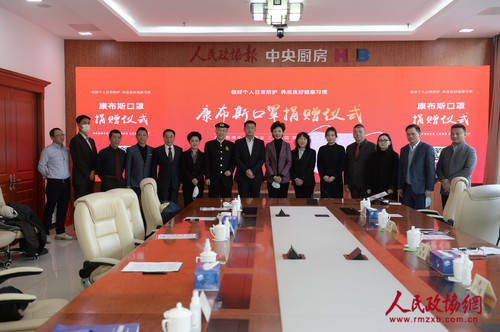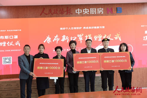 图为捐赠仪式现场 人民政协报·人民政协网记者 田福良 摄 捐赠仪式上,戴秀英委员、施乃康先生和王相伟社长一起为北京市海淀区八里庄街道办事处、海淀区四季青敬老院、东城区特殊教育学校分别捐赠1万只口罩。