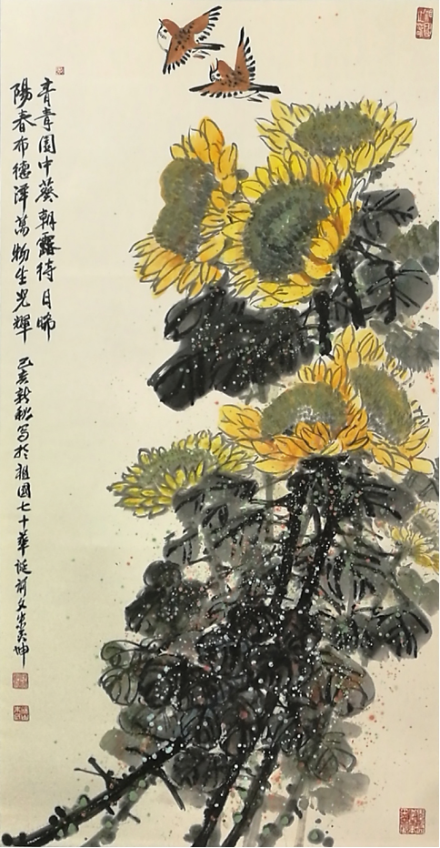 虽然他描绘的是人们常见的牡丹、荷花、石榴、游鱼、蜻蜓、仙鹤,但是意境不同,给人一美景,给人以春光,给人以力量,“情绪饱和,构图新颖,色彩明艳风格多变,清新甜美,生气盎然”,达到了新的技法和风格。在他的作品中,不仅是工笔,他的写意鸟画得也很好。因为有扎实的工笔造型功底,画起“写意”来就得心应手了。能工能写,难能可贵也。
