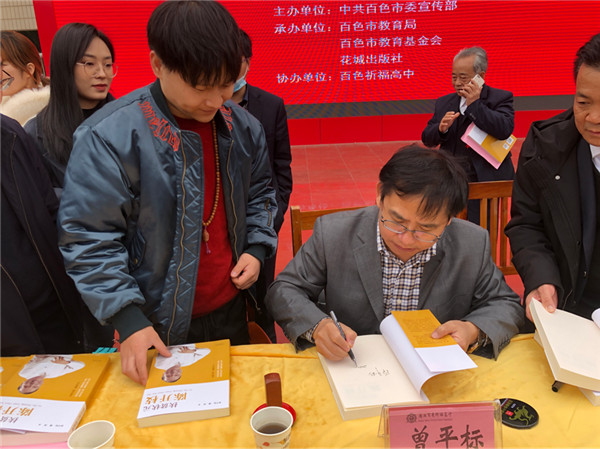 赠书仪式。张春梅 /摄 他为了帮助百色建立扶贫工作长效机制,于2012年主持创立了百色教育基金会,选定每年12月11日小平同志领导百色起义的周年纪念作为慈善筹款日,并担任基金会名誉会长到处筹款。他自己每年也拿出一些退休金,至今已捐出近40万元。基金会成立以来,共筹款3.23亿元,资助贫困学生56696 人,奖励优秀教师12646人,资助困难教师266人。