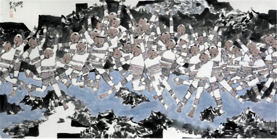 艺术来源于生活而又高于生活,郝爱平老师不仅仅追求第一视角表现孩子们欢乐的生活,同时也不断探索新的绘画形式,将童子与祖国大好河山更好的联系在一起。他从1992年开始有意识的画童子,起因源于画家母亲在幼儿园工作,童年在幼儿园的欢乐时光深深地留在了他心里,后来下放农村更是加深了画家的农村情结,加之多年对孩子的喜爱,画童子便是画家表达自己对生活认识的一部分,在表现手法上他认为童子应该一样,没有贫富贵贱阶级之分,中国传统文化就有招财童子、童子抱鱼一说,孩子对人们来说也代表着对未来的想象以及无限的期望,他力求用更自由的手法表现孩子单纯、活泼好动的一面。