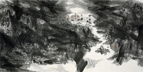 2009年他开始山水画写生,祖国大好河山的壮阔深深地打动着着他,于是他开始尝试将这两个题材结合在一起,从最开始山水只用来点缀童子画到后来缩小人物,将山水的博大与孩童的美好两者和谐的融合在一起,他进行了多方位的尝试,生活视角的转换便是绘画形式探索的重要表现之一,从画面中只有童子到从更高处第三视角画童子,用更高的视角让童子藏于大山之中,却也不失生动,大山的静与孩童的动,有时甚至山水也动起来,动静相宜别具一番气象。同时更大视角的变化也是画家内心世界的的变化,那个世界是将所有美好都集中在他的画纸上。