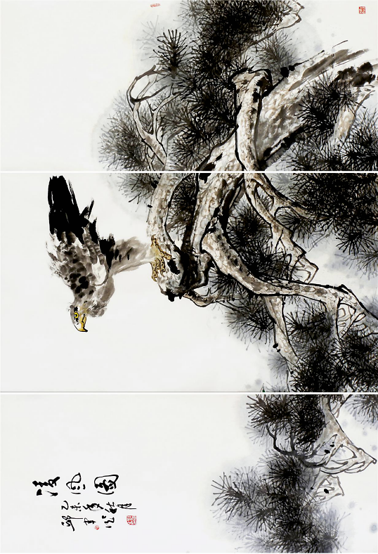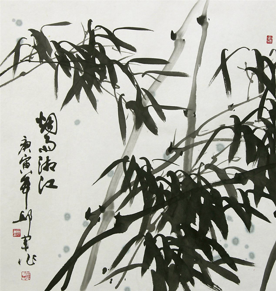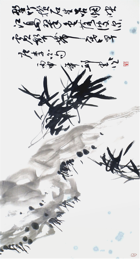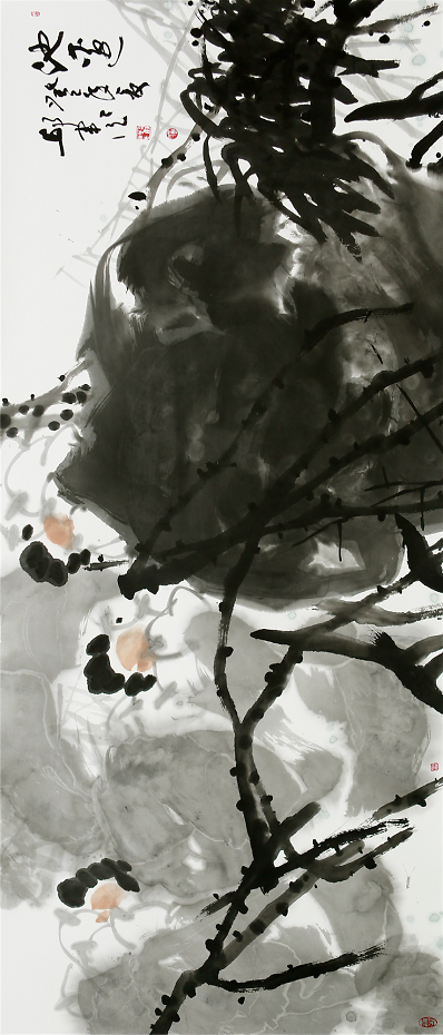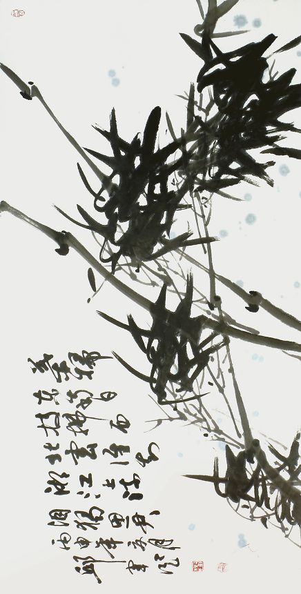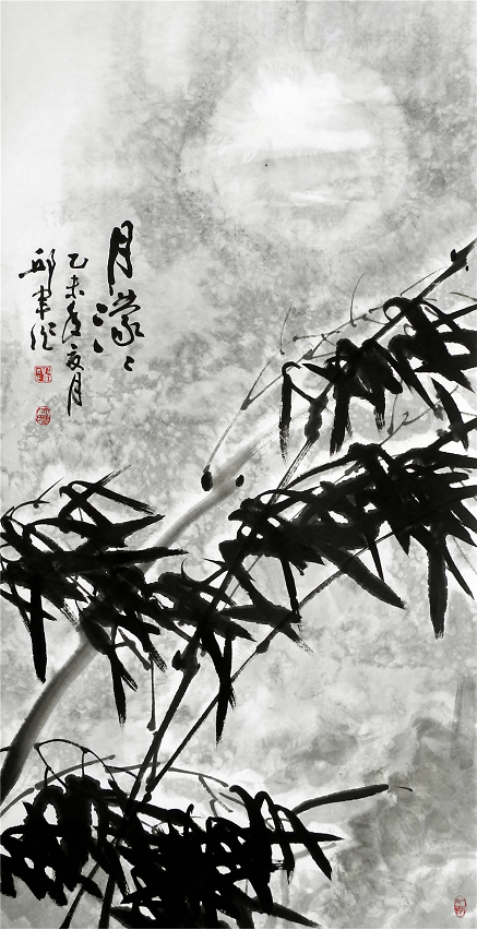 恽南田云:“笔中之笔,墨外之墨,非高人逸品,不能得之,不能知之”。从中国写意画的笔墨能体悟出高品格,体现出东方艺术的独特魅力,这也是中国画与西方绘画从形式到观念上的巨大差异。邱君在章法、笔墨上苦下功夫,讲究构图大的黑白对比与协调,讲究用笔的洗练和变化,讲究墨色的浓淡关系,用笔与墨色的律动与节奏,赋予了他作品以情趣和神韵。其用墨着色处处体现整体和谐、雅致的原则,对比鲜明,构成强烈的视觉冲击力,增强了画作的艺术效果。墨色多是丰沛的,湿润的,尽显空灵奇崛、宁静典雅之气。从作品清净、纯真的格调看,作者创作时的心境是淡定和宁静的,没有任何浮躁的情绪。