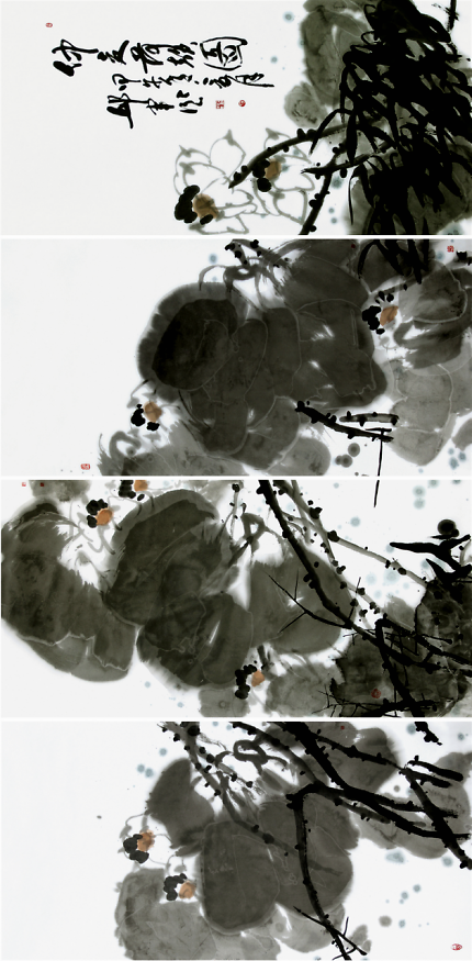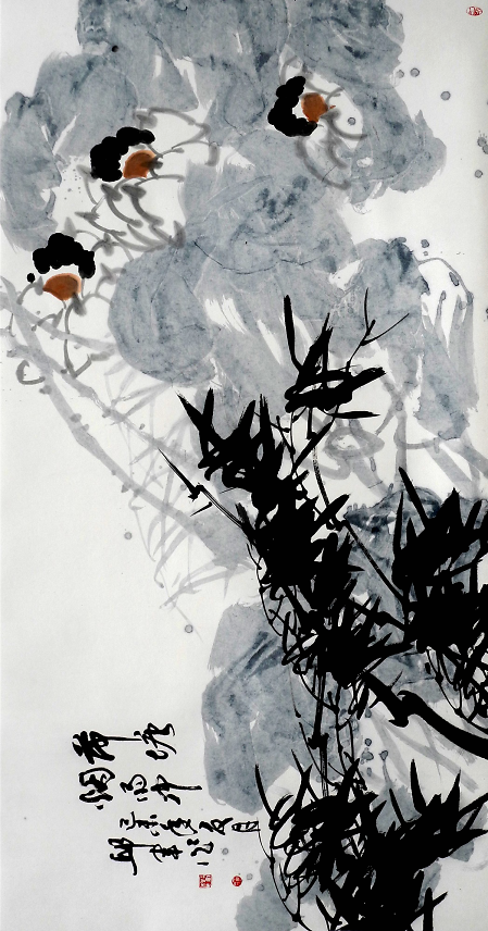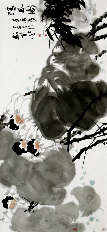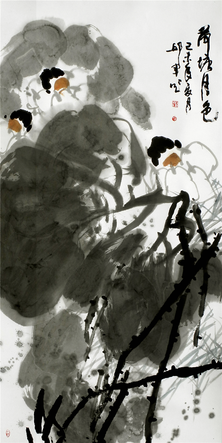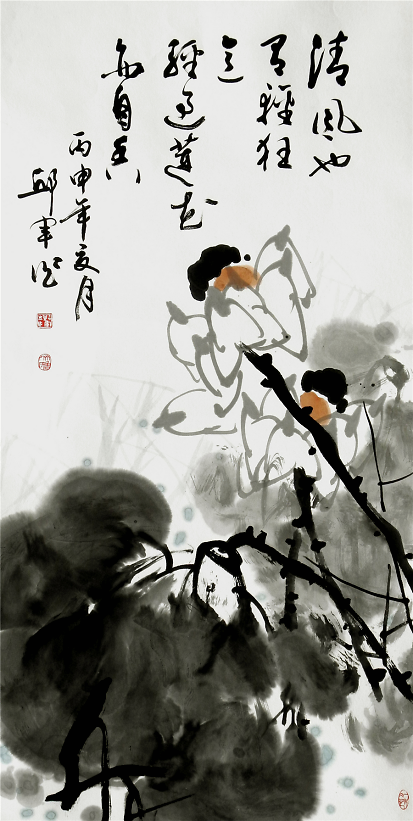 邱君所作荷花正是形神兼备之妙品,他的作品不拘泥于传统图式,也非对客观物象的描摹,其作清新典雅,内敛蕴籍,意境宏阔,意象丰富又浑然一体,读之则有一股清新古雅的气息扑面而来。其作气息纯正,空灵洒脱,大笔大墨且格调清纯,使之于具象中超乎司空见惯的摹写,生发出一种摄人心神和魂魄的艺术感召力。