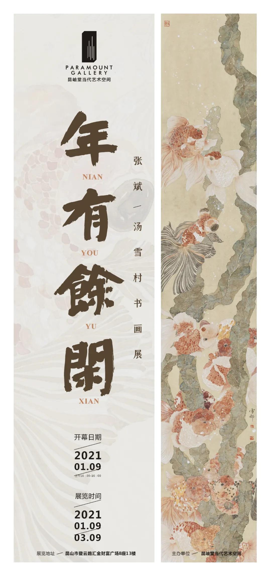 年有餘閑 Ease & Leisure in the year 张斌 汤雪村书画展 展览时间 2021.1.9—2021.3.9 展览地址 昆山市登云路汇金财富广场B座13楼 主办单位 昆岫堂当代艺术空间 PREFACE 前言 /// 數月前,我與吾師張斌閑話,說起有機會可合辦聯展,至於展覽主題,我與張師皆是愛魚養魚之人,且魚自古有富足有餘,悠遊自得之意,便壹拍即合。展覽恰值年末,便定展名為“年有餘閑”。 A few months ago, my mentor Zhang Bin and I were talking about the opportunity to co-organize a joint exhibition. As for the theme, since we all enjoy raising and watching fish, and fish symbolize abundance and leisure in the east since ancient times, our view strike an instant chord with each other. The exhibition, coincided with the end of the year, was named "Ease&Leisure in the Year". 原語出陶潛詩句:戶庭無塵雜,虛室有余閑。此處將“余”更具化為“餘”,可指:“餘錢”,“餘年”,“餘粟”。閑則可借歐陽子句“得朋為樂偶偷閑”之意。 The original saying of Ease comes from Tao Qian's poem: My house is free from worldly moil or gloom, while ease and quiet permeate my private room. Here, “ease” is visualize to "餘" (traditional Chinese), which can refer to “spare money”, “spare time”, “surplus”, and “leeway”. While Leisure originates the meaning of Ouyang Xiu's poem: “Being happy to get friends, and occasionally at leisure with them".