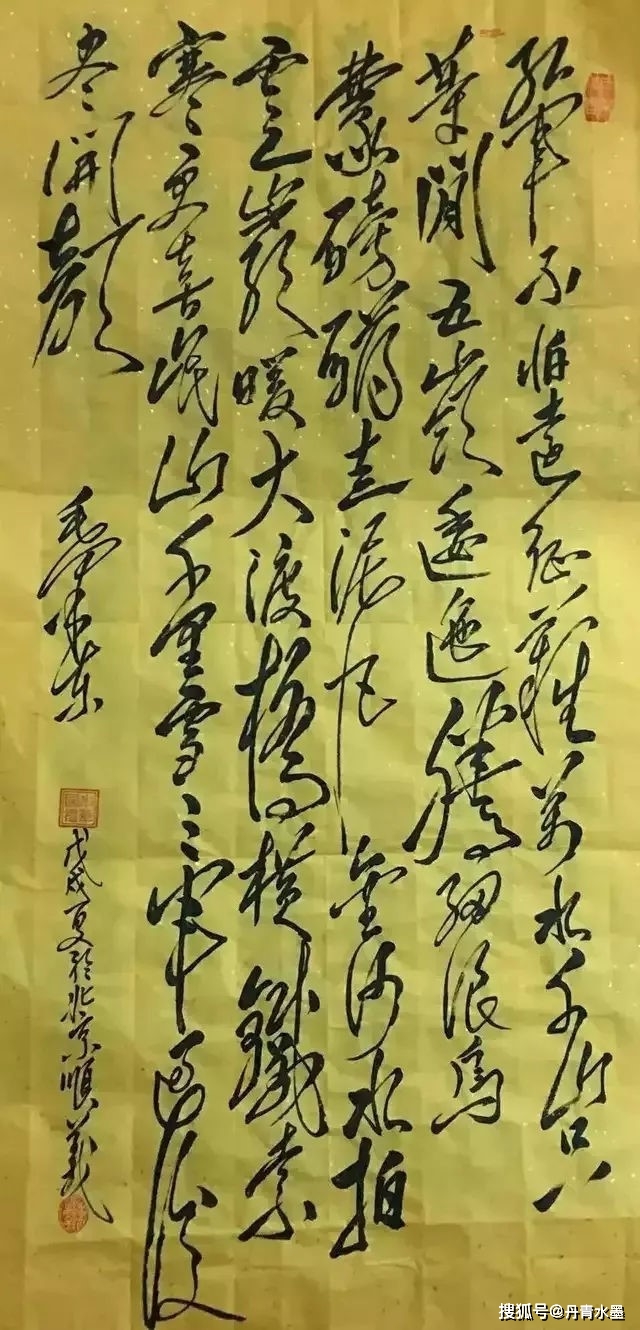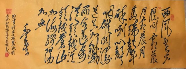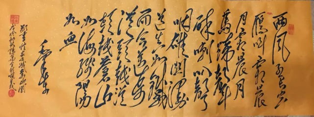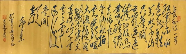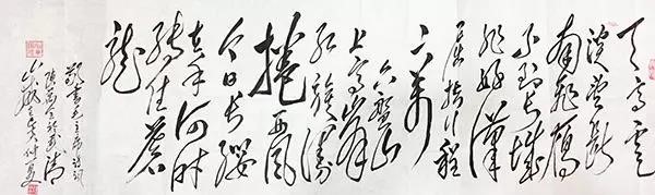 古人说:"草书要有气势,气须熟中来,有气则有势",而“风范气候,极妙参神。但取精灵,遗其骨法,若拘以体物,则未见精粹,若取之象外,方厌膏腴,可谓精妙也。”只有“取之象外,”突破有限的形象,才能做到“气韵生动”,才能现“道”,而于从艺者来说,如果没有高难度的技巧做依托,又何足论道呢? 古人说:“书之妙道,神采为上,形质次之;兼之者,方可绍于古人。”(南齐王僧虔)形质反映了书法家的功底及结字、结篇的审美情趣,神采则反映了书作的意境。文字只是语言的符号,好的书法使文字所表达的内容的更深层次的意境让人能够体味,欣赏陈万全老师的毛体书法,使用牵丝连绵的大草笔法,基本上按楷书笔顺,一点一画都不略去地写出字来,让人感受到一种独特的狂草的线条美。横斜竖直、扬撇抑捺,独特的横折竖,多变的方圆相济与传统的书法横平竖直,抑撇扬捺迥乎不同。