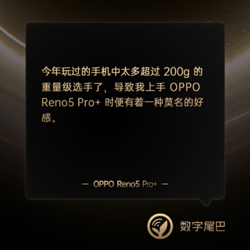 来自权威媒体“网易手机”的评价是,OPPO Reno5 Pro+无论是设计工艺,还是握持手感都达到了Reno系列的最好水平。而“数字尾巴”则表示,今年玩过的手机中太多超过200g的重量级选手,导致他对OPPO Reno5 Pro+的上手体验有一种莫名的好感。