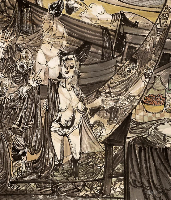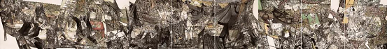 《湘江古岸》创作自述: 我常常梦想,要给湘江古岸缝制一件没有忧伤只有慈悲的睡袍: 把一摞摞发生在湘江两岸的故事,用春风剪裁成形状各异的碎片,用旧日时光搓捏成一根柔韧的绳,用我沾满泥土的手,梳理午夜里仍然有点闷热的七月的风,然后,用绳把碎片联缀成一袭五彩斑爛的睡袍…… 当我完成这幅十米的《湘江古岸》时,突然觉得自己到了梦醒时分…… 陈小奇 己亥荷月