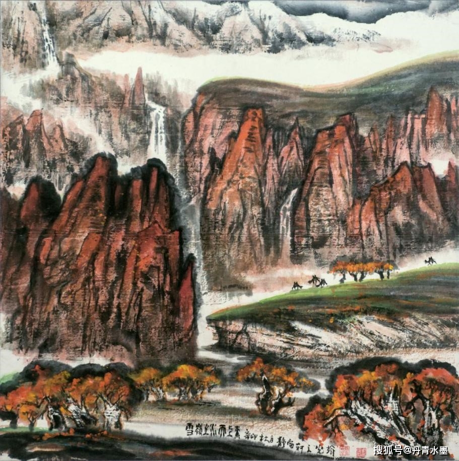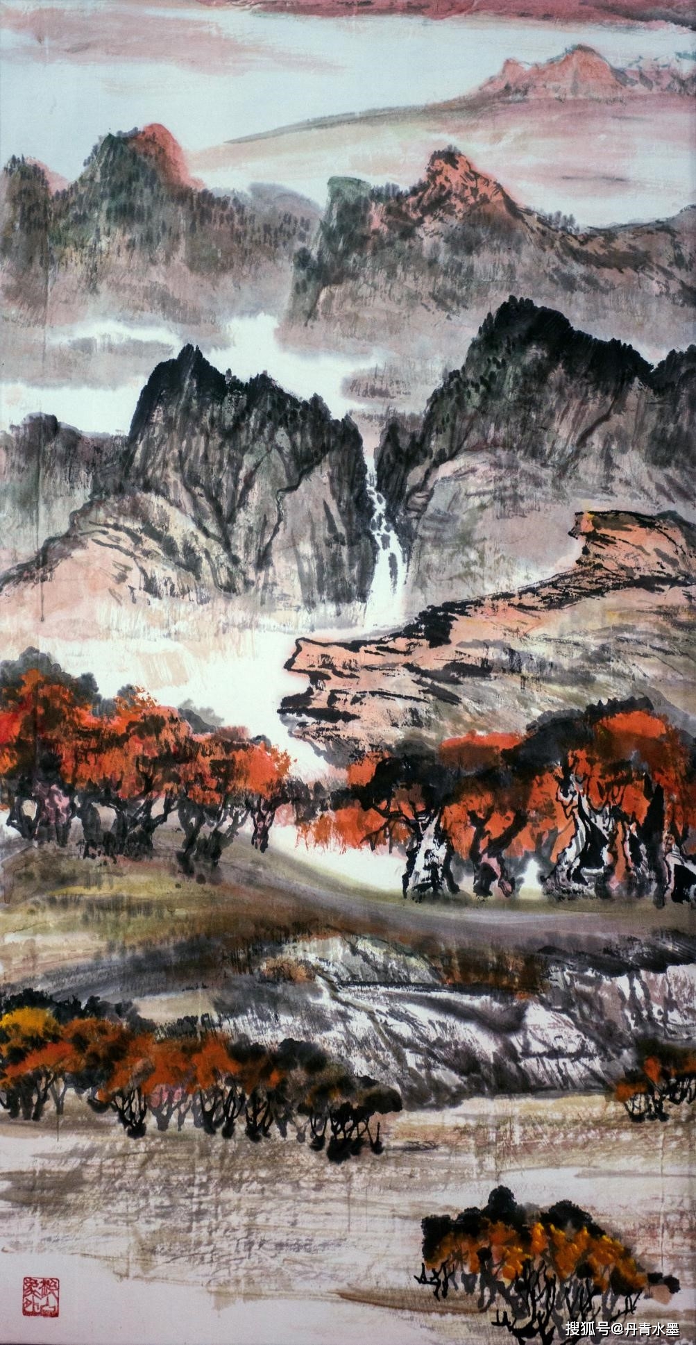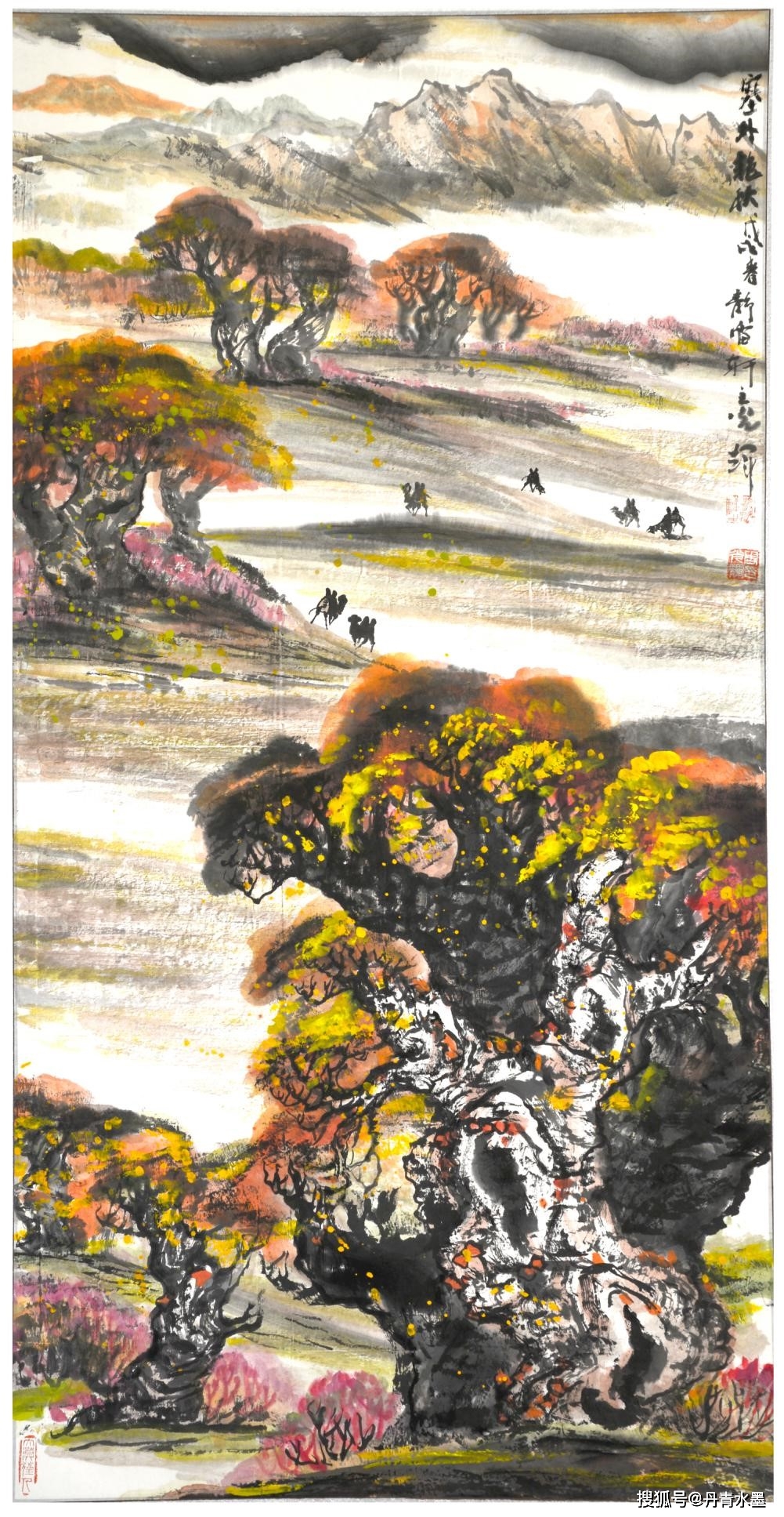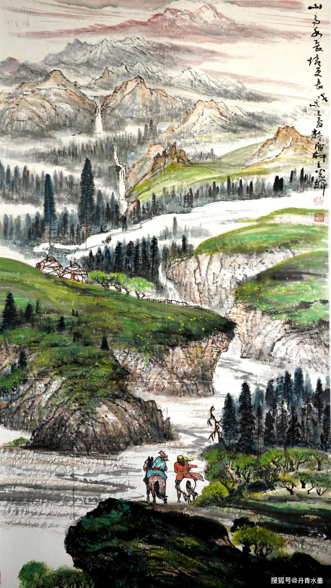 抛开了色彩,几乎无法表现深秋十月金灿灿的胡杨。盛夏百花盛开的牧场,那晨曦中金光闪闪的雪峰、晚霞笼罩下的山峦、还有那些赤红的峡谷、青紫色的群峰……。 如果你只用"分五色"的墨来表现,那简直是不可思议的事。哪怕你再有本事把墨分成十色、百色,你也无法给观众表达你眼前令人震撼,令人陶醉的绚丽斑斓的色彩感受。于是色彩便成了西部山水画一种特殊,而且是必须的语言形式。我们必须摆脱重墨轻色的传统审美情趣的束缚。重新建立起属于新疆的山水画理论体系,建立适合新疆的审美标准。不能用吃海鲜的标准来品评我们的烤羊肉。 如何不失传统中国画的特色,又能有机地将色彩融入中国传统绘画的形式语言中,便成了我长期思考和探索的问题。为了更准确生动的表现眼前的一切,于是我便把色当成墨,有时也把墨当成色,用传统的毛笔在宣纸上作画的方法创造性的任意挥洒皴擦、点染,以求较准确的表现对眼前景物的感受。在写生中不知不觉的创造出一套适合表现新疆景物特征的技法。使之既不失传统的中国画之笔墨精魂,又能较精确、生动、神形兼备的表现眼前的一切,这大概就是"外师造化,中得心愿"吧。 墨和色不是对立的,墨即是色,色即是墨。两者相辅相成,实现墨色互补,才能准确生动的表现新疆山川特征。新疆将是中国山水画开拓的新领域,色彩必定是中国画技法突破的最大空间。