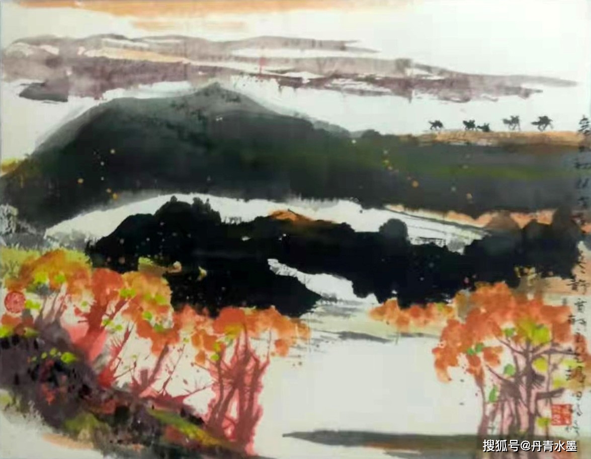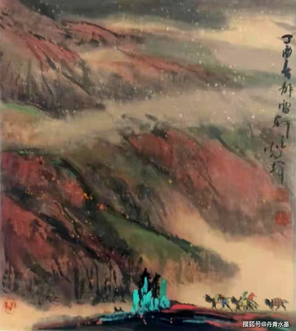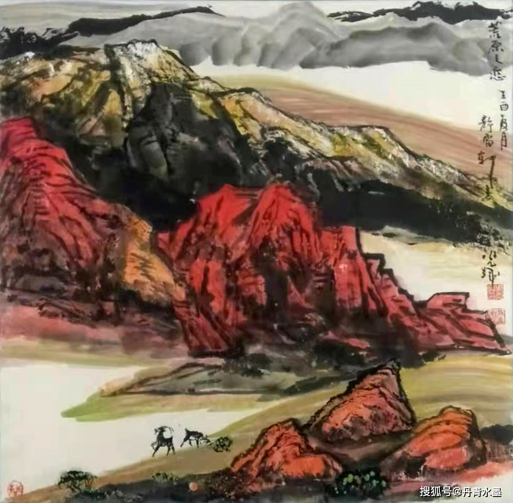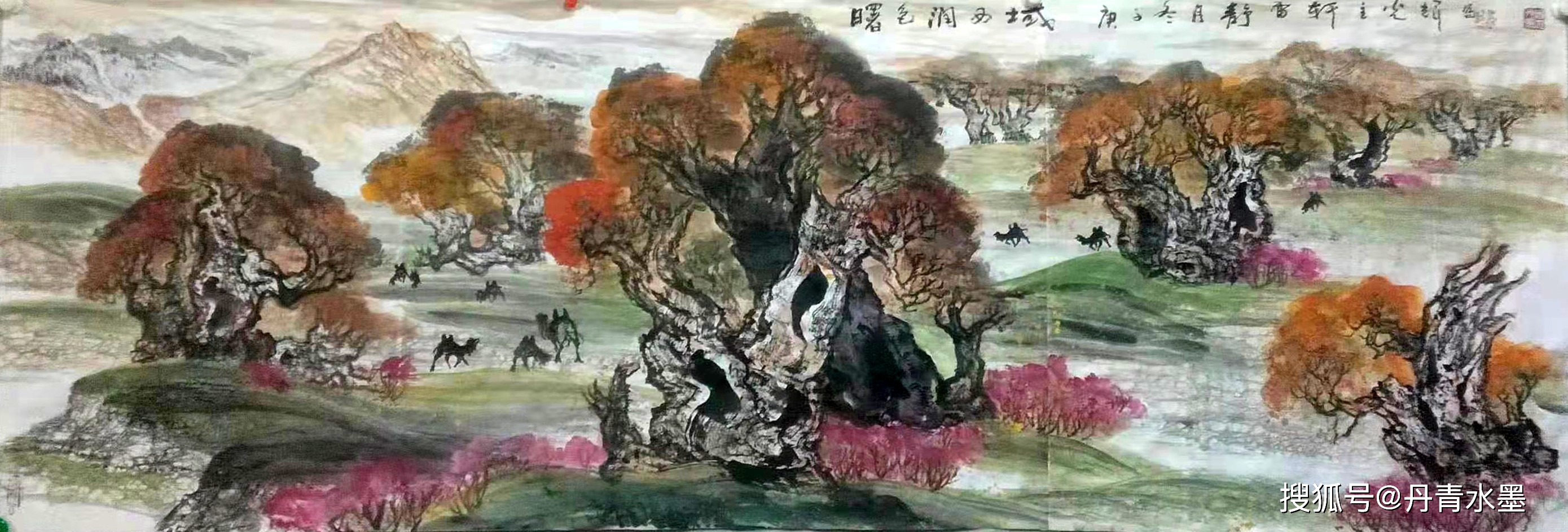 抛开了色彩,几乎无法表现深秋十月金灿灿的胡杨。盛夏百花盛开的牧场,那晨曦中金光闪闪的雪峰、晚霞笼罩下的山峦、还有那些赤红的峡谷、青紫色的群峰……。 如果你只用"分五色"的墨来表现,那简直是不可思议的事。哪怕你再有本事把墨分成十色、百色,你也无法给观众表达你眼前令人震撼,令人陶醉的绚丽斑斓的色彩感受。于是色彩便成了西部山水画一种特殊,而且是必须的语言形式。我们必须摆脱重墨轻色的传统审美情趣的束缚。重新建立起属于新疆的山水画理论体系,建立适合新疆的审美标准。不能用吃海鲜的标准来品评我们的烤羊肉。 如何不失传统中国画的特色,又能有机地将色彩融入中国传统绘画的形式语言中,便成了我长期思考和探索的问题。为了更准确生动的表现眼前的一切,于是我便把色当成墨,有时也把墨当成色,用传统的毛笔在宣纸上作画的方法创造性的任意挥洒皴擦、点染,以求较准确的表现对眼前景物的感受。在写生中不知不觉的创造出一套适合表现新疆景物特征的技法。使之既不失传统的中国画之笔墨精魂,又能较精确、生动、神形兼备的表现眼前的一切,这大概就是"外师造化,中得心愿"吧。 墨和色不是对立的,墨即是色,色即是墨。两者相辅相成,实现墨色互补,才能准确生动的表现新疆山川特征。新疆将是中国山水画开拓的新领域,色彩必定是中国画技法突破的最大空间。