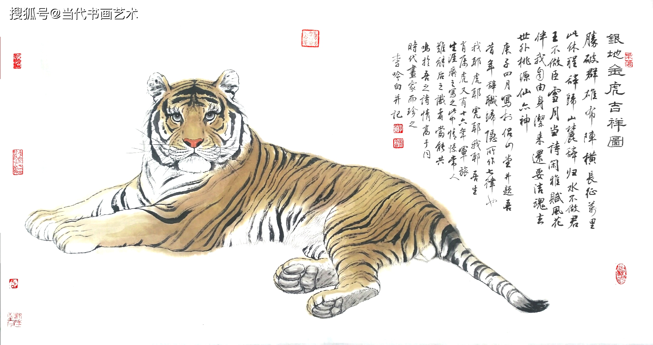 李吟白的绘画,一直在求变中探索。除了山水画的变法,他多年来还一直在探索山君的自我画法,作为诗人书画家,他首先是以诗情立画意。虎在他的笔下,已不是单纯的王者,而是他用自填诗词、题跋书法,及绘画,对勇往直前、所向披靡,而又淡定从容、大无畏、大自信的大英雄的赞美,它们在李吟白笔下,或是具有梅花品格、独步于“月明林下”的美人,或是具有李吟白内心诗意、隐卧于"雪满山中”的高洁之士…,它们没有其他虎画家笔下猛虎的那种常见的张牙露爪,李吟白表达的是他们不怒自威、不动声色的大自信大自在大英豪之风范,虽然还不完美,但是它们是李吟白诗书画合一,且因为修养深厚的自作诗词和功力深厚的书法题跋,而与同时代画家完全不同的`具有深厚文化底蕴的独特创作。 |