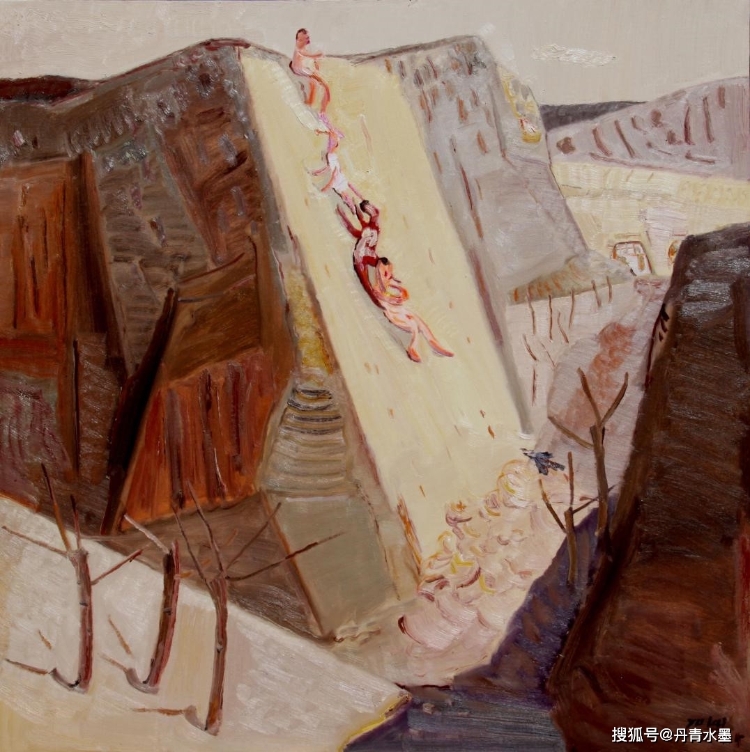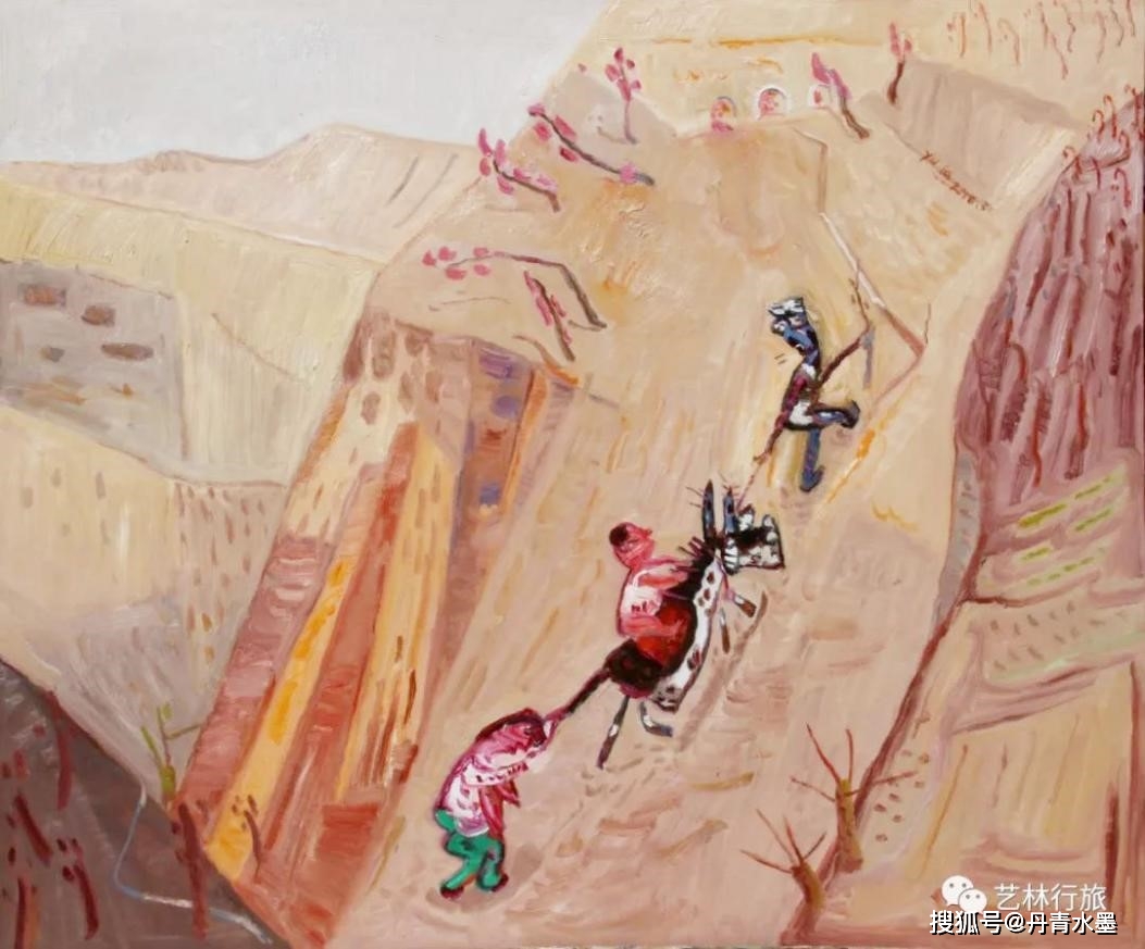 群静静地眺望着远处绵延起伏的原野和远处的公路。这让我想起了卡之琳的诗,“你站在桥上看风景,看风景的人在楼上看你,明月装饰了你的窗子,你装饰了别人的梦”。又如作品《羊群》,于来将山上的羊群引领到天上,和白云连接到一起,这种大胆的处理完全是心愿所致。由此看出于来感情细腻充满诗性浪漫的一面。作品《溜马马》,描绘的是青年男女从土坡上滑下,表现美好的爱情。作品《老八》描绘的是一个小男孩在数家中的老母猪生了几只猪娃,这些画面有着很强的生活气息和人情味,也体现了于来对生活敏锐的观察力和热爱。而这些貌似简单的生活场景要想很好地组织在一幅画中是非常难的,需要构图、色彩、造型、细节等全面的绘画修养才能实现。 于来这些年来不断地进修学习,出国亲临目睹西方大师的油画原作,走访国内博物馆看中国的传统文化,游历名山大川以陶冶性情……这些努力汇聚成了他今天的这批作品,让人高兴,也衷心祝贺他。 路虽远心已至,相信于来的绘画艺术会越来越好! 2017年10月27日于北京